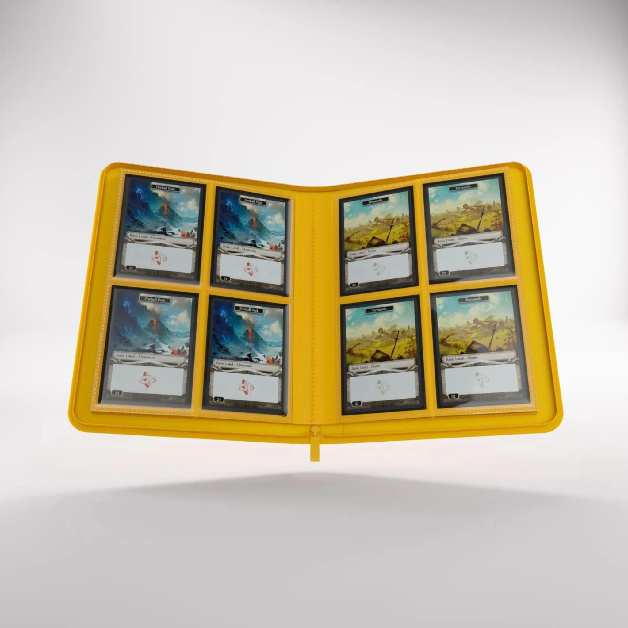 Gamegenic Zip-Up Album 8-Pocket Binder Yellow The Zip-Up Album 8-Pocket is a great way to collect and organize your MTG cards. The album is covered with the innovative Nexofyber surface to create a comfortable touch & feel combined with an elegant look. Protects up to 160 cards. Sales Tax: $1.69 $25.99 $24.99 Add To Cart Buy Now Description Gamegenic Zip-Up Album 8-Pocket Binder YellowThe album 8 pocket is a great way to collect and organize collectible cards of standard or Japanese size, offering excellent organizational features and a capacity to hold a significant number of cards securely. The zip up album 8 is a specialized storage solution with 8 pockets and protective features, catering to collectors who value organization and durability. The album is covered with the innovative Nexofyber surface to create a comfortable touch & feel combined with an elegant look.The Nexofyber outer shell feels very similar to a premium vegan leather material (polyurethane) of competitor deck boxes. Nexofyber creates a unique water repellent matte finish compared to a glossy shine of other products.The inside of all Zip-Up Albums is covered with soft microfiber lining. Reinforced, rigid covers add protection to keep card collections safe.The album holds 20 pages with 8 side-loading pockets each for a total capacity of 160 cards (even double-sleeved). Four compartments per page are perfect for PLAYSET collections (4 cards of each).A durable zipper closes this album from all sides.FeaturesPremium materials (Nexofyber surface + microfiber inner lining)Uniquely designed zipper puller for maximum grip20 side-loading pages to hold up to 160 sleeved cards*COLORMATCH: Cover, pages and strap in matching colorsExtra-wide elastic strap with reinforced stitching8 side-loading pockets per page keep cards shake-safePerfect for PLAYSET collections of 4 cards eachHolds standard- and Japanese-sized cardsOptimized for double-sleeved cardsAcid-free, no PVCOptimized for Gamegenic Sleeves. Sleeves from other brands may affect capacity/compatibilityPremium Zip Up Album FeaturesThe Premium Zip Up Album is designed with luxurious materials that make it a standout choice for collectors who want to showcase their favorite cards in style. The innovative Nexofyber surface not only provides a comfortable touch and feel but also adds an elegant look that will make your collection truly shine. Inside, the soft microfiber lining offers an extra layer of protection and comfort, ensuring your cards remain in pristine condition.The album’s rigid covers add protection to keep your card collections safe from any potential damage. Additionally, the durable zipper closes the album from all sides, providing secure storage for your valuable cards. Whether you collect standard or Japanese size cards, this premium zip up album is the perfect choice for keeping your collection organized and protected. With its premium materials and thoughtful design, this album is a must-have for any serious collector.Binder Design and OrganizationThe Premium Zip Up Album boasts a sleek and modern design, featuring a matching color acid-free interior that perfectly complements your cards. With 20 pages, each containing 8 side-loading pockets, this album provides ample space to organize your collectible cards, accommodating up to 360 cards even when double-sleeved. The inner microfiber lining and soft microfiber inner lining work together to create a safe and comfortable environment for your cards.The rigid covers and durable zipper ensure that your card collections remain secure and protected at all times. The innovative Nexofyber surface not only adds to the album’s aesthetic appeal but also provides a comfortable touch and feel. Whether you’re collecting standard or Japanese size cards, the Premium Zip Up Album is the ideal choice for organizing and showcasing your favorite cards. With its thoughtful design and high-quality materials, this album offers both style and functionality for any collector. Technical Data Color Options Exterior Colors White, Blue, Black, Red, Green, Purple, Yellow Interior Pages Color matched to Exterior Card Counts Sleeved 160 Material Outer Nexofyber Inner Microfiber lining Product Outer Dimensions Length 9.61 in Width 7.28 in Depth 1.42 in