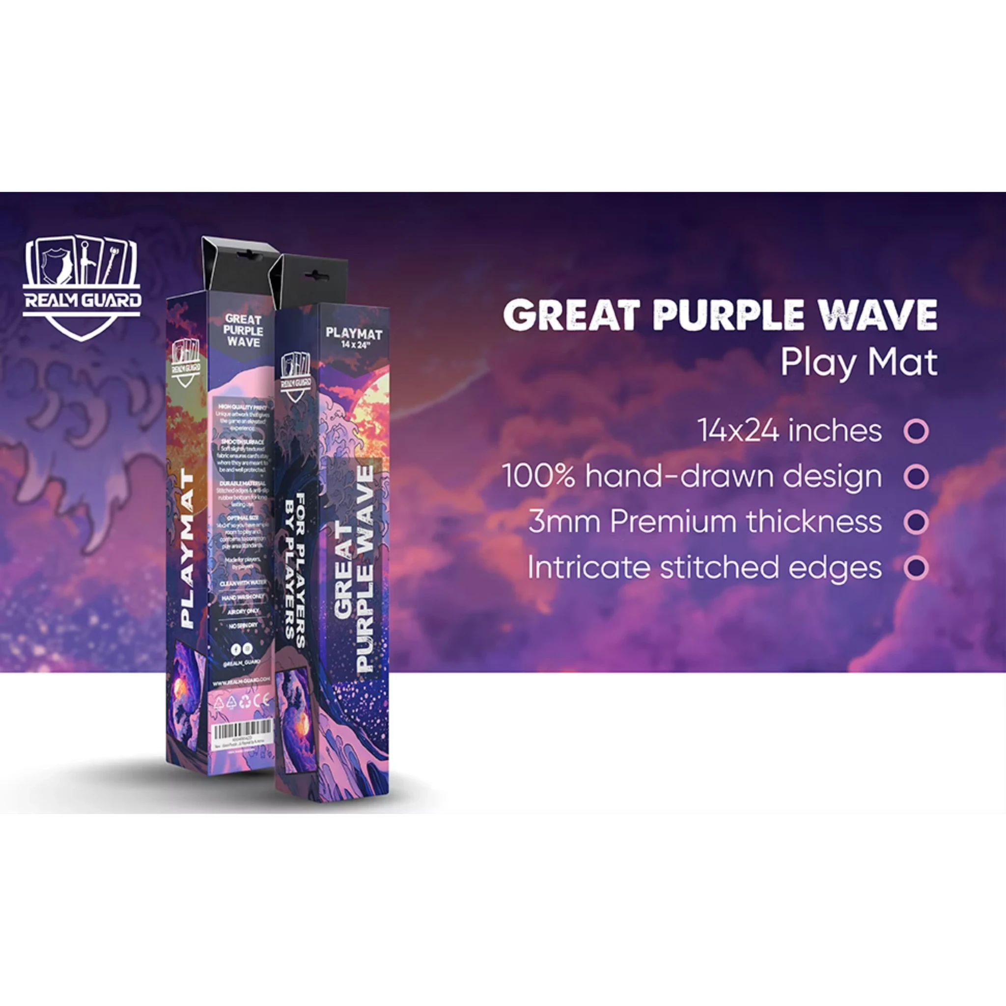 AI Armor Great Purple Wave Playmat - Stitched Premium TCG playmat with Ongky Widyanto’s Great Purple Wave art! Stitched edges and non-slip backing make it the ideal Magic the Gathering playmat. Sales Tax: $1.69 $24.99 Add To Cart Buy Now Description AI Armor Great Purple Wave Playmat – Stitched EditionImmerse Your Game in Legendary ArtTransform your tabletop experience with the AI Armor Great Wave Playmat – Stitched Edition, now proudly part of the Realm Guard collection. This accessory blends timeless Japanese art with premium quality, making it one of the most striking tcg playmats for serious players and collectors alike.Breathtaking Design by Ongky WidyantoRenowned artist Ongky Widyanto captures the dynamic energy of the ocean in a vibrant reimagining of the iconic Great Wave. Deep blues and foamy crests surge across the mat, bringing motion and excitement to every match. Whether you’re battling in Friday Night Magic or a weekend tournament, this art draws players into the heart of the action.Built for Magic: The Gathering and BeyondMeasuring 14 x 24 inches, this playmat provides a spacious, organized battlefield for decks, dice, and tokens. Designed with playmats mtg enthusiasts in mind, it also serves perfectly for Pokémon, Lorcana, Flesh and Blood, and other popular trading card games. Every shuffle and draw glides smoothly across its professional-grade surface, making it a top choice for any magic the gathering playmat collection.Premium Materials for Serious PlayRealm Guard—formerly AI Armor—crafts their gathering playmats from a thick, high-quality cloth top paired with a non-slip rubber base. Cards stay clean and protected while the mat remains stable during high-stakes battles. Reinforced stitched edges prevent fraying, so your Great Wave mat remains a centerpiece of your gaming gear for years.Key FeaturesPremium Thick Material protects cards and offers a smooth surfaceStitched Edges guard against wear for long-term durability14 x 24 Inch Size provides ample space for competitive or casual gamesArtist Credit: Ongky Widyanto for exclusive Great Wave artworkRealm Guard Quality trusted by TCG players everywhereWhy a Quality Playmat MattersDedicated tcg playmats preserve the condition of valuable cards and sleeves. The soft cloth surface reduces friction during shuffling, while the stable rubber base prevents slipping. Whether you’re protecting prized foils or ensuring a consistent, professional game space, a reliable magic playmat is essential.Portable and Travel-ReadyThe AI Armor Great Wave Playmat rolls up neatly, making it easy to add to your bag or cart when heading to tournaments, friends’ houses, or local game stores. Lightweight and flexible, it packs down without creases so you can continue your gaming adventures anywhere.Perfect for All Card GamersFrom competitive Magic events to casual kitchen table sessions, this mat enhances any TCG experience. Its universal design suits players seeking stylish, functional playmats that complement their decks and protect their cards during intense battle.The Realm Guard StandardFormerly known as AI Armor, Realm Guard accessories combine eye-catching art with performance-focused engineering. Their playmats mtg line showcases talented artists while ensuring professional quality for thousands of shuffles.A Collector’s Statement PieceBeyond gameplay, the AI Armor Great Wave Playmat doubles as a display piece for desks, offices, or gaming rooms. The vibrant color palette and cultural resonance of the design create a conversation starter and an artful accent for any collection of gathering playmats.Easy Care and MaintenanceCleaning is simple: wipe with a damp cloth to maintain the smooth surface. The stitched edges prevent peeling, so your playmat remains pristine. With proper care, this magic the gathering playmat will last through countless matches.SpecificationsDimensions: 14 x 24 inchesMaterial: Premium cloth top with non-slip rubber baseEdge: Reinforced stitched edgesArtist: Ongky WidyantoBrand: Realm Guard (formerly AI Armor)Final ThoughtsThe AI Armor Great Wave Playmat – Stitched Edition is more than just a game accessory—it’s a statement of style and quality. Ideal for TCG players who value art and performance, it stands out among tcg playmats for its durability, comfort, and unforgettable design. Technical Data Dimensions Length ~24 in Width ~14 in Thickness ~1/8 in (3 mm) Artist Name Ongky Widyanto