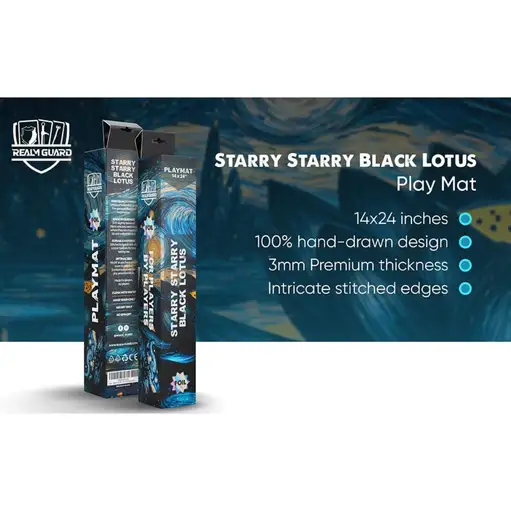 Realm Guard Starry Night Black Lotus Foil Playmat - Stitched Starry Night Black Lotus MTG playmat with foil artwork, stitched edges, and premium material for smooth gameplay. Sales Tax: $1.89 $27.99 Add To Cart Buy Now Description Realm Guard Starry Night Black Lotus Foil MTG Playmat with Stitched EdgesEnhance your tabletop setup with the Realm Guard Starry Night Black Lotus Foil Playmat, a premium accessory designed for players who value both performance and presentation. Featuring artwork inspired by the iconic Black Lotus and illustrated by Ongky Widyanto, this mtg playmat combines striking visual design with durable construction.With its foil detailing and high quality materials, this playmat provides a smooth and protective surface for every game, whether you are competing in tournaments or playing casually with friends.Magic The Gathering Playmat with Premium Foil ArtworkA standout magic the gathering playmat should do more than protect your cards. It should also elevate your play space. The Starry Night Black Lotus design features foil accents that reflect light and create depth, giving the artwork a dynamic presence on the table.This visual design offers:A bold interpretation of the Black Lotus themeFoil elements that enhance contrast and detailA premium look that stands out during gameplayThe result is a playmat that feels both functional and collectible.Black Lotus Playmat with Artist Driven DesignDrawing inspiration from one of the most recognizable cards in Magic history, this black lotus playmat captures a unique artistic interpretation that blends classic imagery with a starry night aesthetic.Artwork by Ongky Widyanto ensures:High resolution detail and clarityA cohesive visual theme across the play surfaceA design that appeals to both players and collectorsThis artistic focus makes the playmat a centerpiece for any gaming setup.Foil MTG Playmat Built for Durability and PerformancePerformance is just as important as appearance, and this foil mtg playmat is built with premium thick materials to support long term use.Key performance features include:A soft cushioned surface for card protectionA stable base that helps prevent slipping during playA smooth texture for easy card movement and pickupThese elements ensure that your cards remain safe from scratches and surface wear while maintaining a comfortable play experience.Stitched Edge Playmat for Long Lasting UseDurability is reinforced with stitched edges, a key feature of any high quality stitched edge playmat. This construction prevents fraying and maintains the integrity of the playmat over time.Benefits of stitched edges include:Increased resistance to wear and tearA clean and finished look around the borderExtended lifespan compared to non stitched alternativesFor players who use their playmat regularly, this added durability makes a noticeable difference.MTG Playmat Standard Size for Versatile UseMeasuring 14 x 24 inches, this mtg playmat provides ample space for cards, tokens, and accessories without overwhelming your play area.This standard size is ideal for:One player setups during competitive matchesCasual games with organized layoutsUse alongside deck boxes and other accessoriesIts dimensions make it easy to transport while still offering a full play surface.Magic The Gathering Playmat for Multiple Card GamesWhile designed with Magic in mind, this magic the gathering playmat is also compatible with other popular tabletop and trading card games. Its smooth surface and durable construction make it suitable for a variety of uses.Players can use this playmat for:Trading card games beyond MagicBoard game setups requiring a soft surfaceGeneral tabletop protection and organizationThis versatility adds value for players with diverse gaming interests.Black Lotus Playmat for Players and CollectorsThe Starry Night Black Lotus Foil Playmat is designed to appeal to both competitive players and collectors. For players, it offers a reliable surface that supports consistent gameplay.For collectors, it provides:A visually striking design with foil detailingArtwork tied to an iconic Magic themeA premium accessory that enhances any collectionThis balance of function and design makes it a strong addition to any gaming setup.Realm Guard Playmat Complete Features14 x 24 inch standard playmat sizeStarry Night Black Lotus foil artworkIllustrated by Ongky WidyantoPremium thick material for durability and comfortSmooth surface for card movement and protectionStitched edges to prevent frayingNon slip base for stable gameplaySuitable for Magic: The Gathering and other card gamesUpgrade Your MTG Playmat ExperienceThe Realm Guard Starry Night Black Lotus Foil Playmat delivers a combination of visual impact and reliable performance. With its foil artwork, stitched edges, and premium construction, it provides everything needed to enhance your tabletop experience.Whether you are preparing for competitive play or building a visually cohesive setup, this mtg playmat offers a dependable and stylish solution. Technical Data Dimensions Length ~24 in Width ~14 in Thickness ~1/8 in (3 mm) Artist Studio Ongky Widyanto
