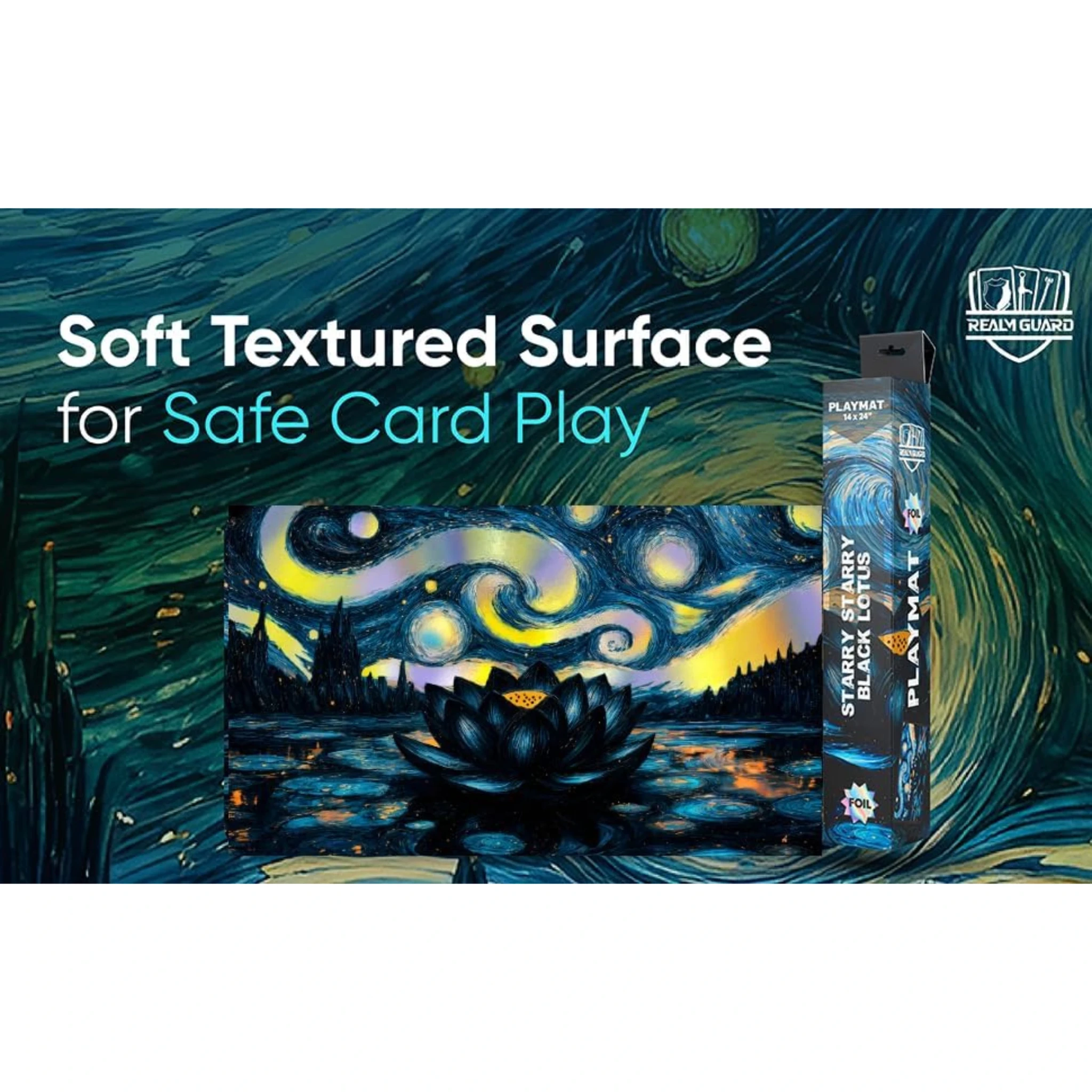 Realm Guard Starry Night Black Lotus Playmat - Stitched $24.99 The AI Armor Starry Night Playmat is designed for gamers who value both function and appearance, this stitched-edge playmat measures 14×24 inches and features a smooth fabric top for easy gameplay, a non-slip rubber base for stability, and a high-resolutio Quick View Add To Cart
