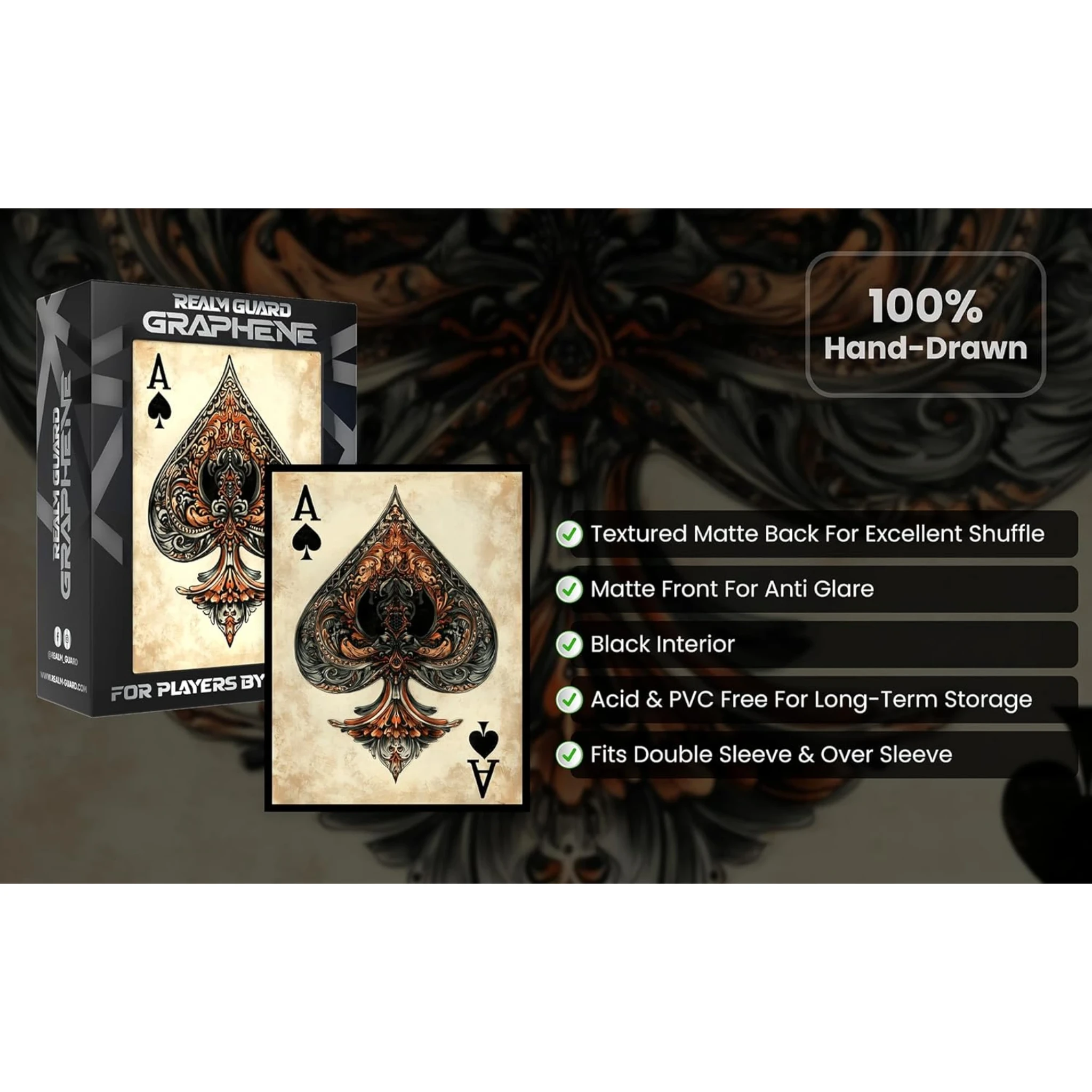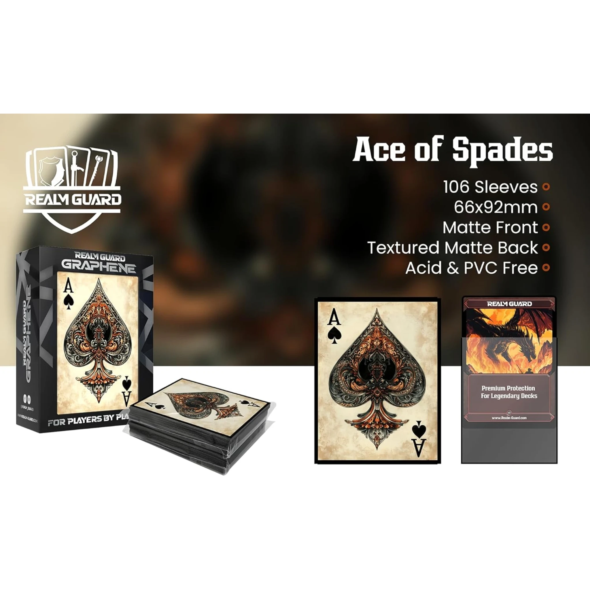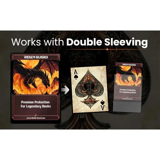 Ace of Spades - Realm Guard Graphene Textured MTG Sleeves - 100 ct Step into the world of western legends and Saddle Up with Ace of Spades Card Sleeves! These card sleeves deliver the perfect combination of protection, style, and performance! Sales Tax: $1.21 $17.99 Add To Cart Buy Now Description Ace of Spades Card Sleeves: Protect Your Cards with Western FlairUnleash the spirit of the Wild West with Ace of Spades Card Sleeves, designed to safeguard your prized trading and collectible cards while adding a touch of outlaw mystique to your gaming experience. Inspired by the legendary Ace of Spades—often called the "Dead Man’s Hand" in western lore—these sleeves blend rugged style with premium protection. Whether you’re a poker aficionado, a Magic: The Gathering player, or a fan of trading card games, these sleeves bring a daring edge to your collection.Rugged Protection for Every GameCrafted with the durability of the Old West in mind, Ace of Spades Card Sleeves offer unbeatable protection against wear and tear. Whether you’re in the middle of an intense showdown at the table or storing your cards between adventures, these sleeves ensure your collection remains in pristine condition.Acid-Free and PVC-Free: Prevent long-term damage to your cards with materials designed to preserve their value and beauty.Black Border with Black Inside: Adds a sleek, professional touch while shielding your cards from light and environmental wear.Matte Finish Back: Offers a superior grip and reduces glare, ensuring easy handling under all lighting conditions.Semi-Gloss Front: Displays your cards’ designs with clarity, so every intricate detail of your collection shines.Whether you're dueling opponents in Magic: The Gathering, summoning monsters in Yu-Gi-Oh!, or simply keeping your favorite poker cards in peak condition, these sleeves are up to the task.Perfect for Any DeckWith a pack of 100 sleeves, the Ace of Spades Card Sleeves are perfect for protecting your deck, whether it’s a 60-card TCG deck, a Commander deck for Magic: The Gathering, or a set of 52 playing cards for your favorite poker games. The sleeves are designed to fit standard-sized cards, making them versatile enough for all your gaming needs.Compatible with:Magic: The Gathering (MTG)Pokemon TCGYu-Gi-Oh!One Piece TCGStandard Playing CardsThe Ace of Spades Card Sleeves give your cards a consistent, rugged look while ensuring they’re well-protected for casual games or high-stakes tournaments.Western Outlaw AestheticChannel the grit and glory of the frontier with sleeves that evoke the untamed spirit of the Wild West. The Ace of Spades has long been a symbol of fortune, risk, and rebellion—a card synonymous with outlaws and gunslingers.The Ace of Spades Card Sleeves feature designs that capture this iconic imagery, making them the perfect choice for players who embrace a bold, rebellious style. Whether you’re playing a deck that thrives on daring risks or you simply admire western themes, these sleeves are a stylish addition to your collection.Engineered for the Perfect GameWhen it comes to performance, the Ace of Spades Card Sleeves deliver a premium experience every time. From the first shuffle to the final draw, you’ll notice the difference:Excellent Shuffling: The matte back and semi-gloss front ensure smooth, consistent shuffles without sticking or clumping.Snug Fit: Each sleeve is designed to fit standard-sized cards perfectly, providing protection without compromising ease of use.Built to Last: Durable materials ensure your sleeves stay in top condition, even after countless games and shuffles.Whether you’re strategizing your next move or dealing a winning hand, these sleeves provide the reliability and ease you need to stay focused.The Ideal Sleeves for Commander DecksFor Magic: The Gathering fans, the Ace of Spades Card Sleeves are especially suited for Commander decks. With a pack of 100 sleeves, you’ll have enough to protect your entire deck and still have extras for tokens or sideboard cards. Protect your legendary cards and ensure they look as striking as the day they were pulled from a booster pack.A Nod to Western LegendsThe Ace of Spades Card Sleeves aren’t just practical—they’re steeped in symbolism. Often referred to as the "card of death" or the mark of an outlaw, the Ace of Spades has been a central figure in stories of the Old West, embodying the spirit of those who lived and gambled on the edge.Whether you're a fan of classic western films, poker legends, or just appreciate the rugged charm of frontier life, these sleeves honor the legacy of the most infamous card in the deck.Why Choose Ace of Spades Card Sleeves?Unmatched ProtectionKeep your cards safe from scratches, spills, and wear with acid-free, PVC-free materials.Western AestheticBring the legend of the Ace of Spades to life with sleeves inspired by the spirit of the Wild West.Versatile FitPerfect for standard-sized cards used in Magic: The Gathering, Pokemon, Yu-Gi-Oh!, and classic poker games.Premium Shuffling ExperienceEnjoy smooth, effortless shuffles that enhance every game.Pack of 100Ideal for protecting Commander decks or full poker sets.Built for Collectors and GamersWhether you’re a seasoned Magic: The Gathering competitor or a casual poker player, the Ace of Spades Card Sleeves are a must-have addition to your card gaming arsenal. For collectors, they offer a way to showcase your cards while keeping them in pristine condition. For gamers, they provide the durability and performance needed to conquer every table.Gift the Spirit of the Wild WestLooking for a unique gift for a card game enthusiast? The Ace of Spades Card Sleeves are perfect for players who love combining functionality with a touch of rebellious style. Whether it’s for a birthday, holiday, or a special tournament, these sleeves make a thoughtful and practical gift.SpecificationsPack Size: 100 sleevesMaterial: Acid-free, PVC-free for long-term protectionFinish: 
