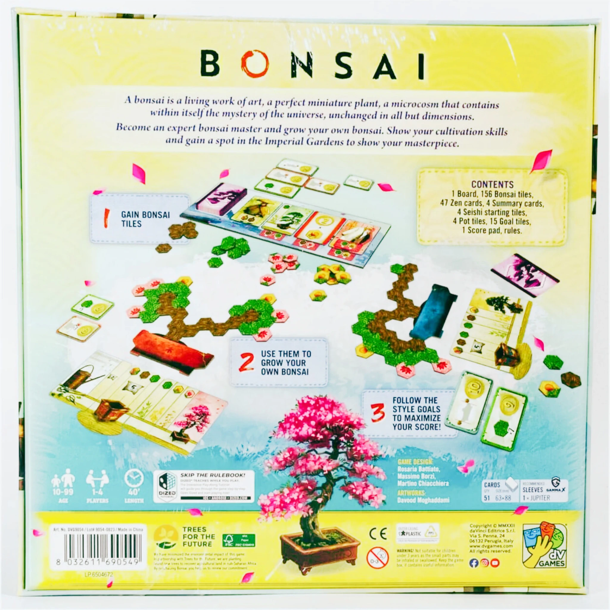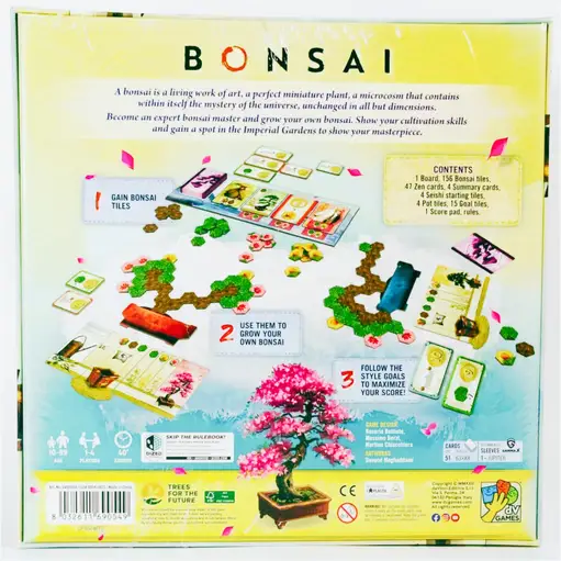 New Bonsai The Bonsai board game offers strategic tile placement, gentle competition, and stunning visuals as players become bonsai masters shaping tiny living art. Sales Tax: $1.69 $34.99 $24.99 Add To Cart Buy Now Description Bonsai board game OverviewThe bonsai board game invites players into a serene world where horticultural artistry and clever tactical choices come together. Blending pattern-building, tile placement, and strategic card drafting, Bonsai captures the quiet satisfaction of shaping a perfect miniature plant. Inspired by the Japanese tradition of nurturing a living sculpture, it asks players to think not only about efficient scoring, but also about aesthetic elements and long-term vision.In this board game, you step into the wooden sandals of expert bonsai masters, all striving to craft the most balanced, pleasing, and impressive tiny tree. The theme is gentle, the rules are approachable, and the gameplay offers a quintessential low-pressure experience that still rewards careful planning. Whether you are gathering hex tiles, chasing specific scoring indicators, or aiming to display your creation in the Imperial gardens, the game maintains a pleasant equilibrium between decisions and relaxation.Bonsai is published by DV Games, a studio known for visually striking titles with refined mechanics. As with their other productions, this one blends attractive components, approachable rules, and layered scoring. The result is a Bonsai board game experience that feels both artistic and strategic.Bonsai game Theme and StoryThe Bonsai game draws heavily on the Japanese term bonsai, meaning planted in a pot, and turns this traditional practice into an accessible tabletop puzzle. While the theme centers on shaping a miniature plant, its presentation goes beyond simple decoration. Every tile you place feels like another step in crafting a living work of art.Players adopt the role of expert bonsai masters intent on growing their own bonsai. The story is simple but immersive: whoever perfects their plant earns the honor of showcasing it in the Imperial gardens. Each growth decision has creative weight, yet only half the stress of true horticulture. The result is an experience of quiet thoughtfulness, where players can follow their own path to beauty while still engaging in friendly competition.Your bonsai becomes a “little potted personality,” shaped tile by tile. Fruit, flowers, wood, and leaves create shifting combinations that present not only scoring opportunities but also visual charm. Each tile contributes to the plant’s character, and the game's aesthetic idea encourages players to see their plant not as an abstract puzzle, but as a growing creation.DV Games Bonsai Components and PresentationThe DV Games Bonsai production quality stands out from the moment you open the game box. The deck presents aesthetic elements clearly, giving each player the information they need without clutter. Tokens feature wood, leaves, and flowers in a style that blends clarity with charm.The hex tiles are cleanly illustrated, allowing players to read patterns at a glance. Many gamers praise the game's visual goodness, noting that the components feel purposeful and thematic rather than purely functional. The wooden textures and soft colors match the overall tranquil tone.Additionally, the bonsai container on each player board helps guide placement while emphasizing the concept of shaping a real miniature plant. Throughout the game’s design, DV Games balances usability with atmospheric details, making the bonsai game a pleasure to interact with round after round.Bonsai board game review of GameplayA Bonsai board game review of gameplay reveals a rewarding mix of choices, pattern recognition, and card-driven expansion. On each turn you choose one of two actions: meditate or cultivate.Meditating lets you take one of the face-up cards on the board and also collect the Bonsai tiles lying beneath the chosen card. This action builds your supply of tiles and expands your long-term strategy.Cultivating allows you to place tiles from your personal pool onto your bonsai. You may place a number of tiles equal to the symbols on your Seishi tile plus any on your Growth cards. Each symbol gives you permission to place a particular type of tile, so timing and planning become essential.As the deck gradually empties, the game builds toward its finale. When the last card is revealed, the endgame is triggered. Each tile in your plant scores points depending on the composition you’ve achieved:Wood scores nil but supports structure.Flowers score depending on surrounding patterns.Fruit scores based on leaf adjacency.Several scoring indicators guide your choices.The tension arises from shifting combinations, multi-tiered objectives, and endgame scoring bonuses. Players can attempt to meet Goal tiles, each offering its own reward. At times you must decide whether to claim a Goal tile early or skip it to attempt a harder one later.This blend of decisions creates an enjoyable balance: engaging without being overwhelming, creative without being chaotic, and thoughtful without too many surprises. It’s the kind of game that appeals to players looking for light puzzles, strategic card games, or any experience where artistic impulse plays a role.Bonsai strategy game Mechanics and DepthAs a Bonsai strategy game, Bonsai shines through its interconnected systems. The core of the strategy is tile efficiency—gathering the right mix of hex tiles, placing them in the most advantageous spots, and planning your arrangement several turns ahead. Because each tile type interacts differently with the others, players must think holistically.The scoring criteria are varied enough to support different strategies across games. Some players chase patterns involving flowers, while others lean into fruit adjacency or seek to create fully surrounded holes. The mix of wood, leaves, and other patterns forces you to evaluate your options const