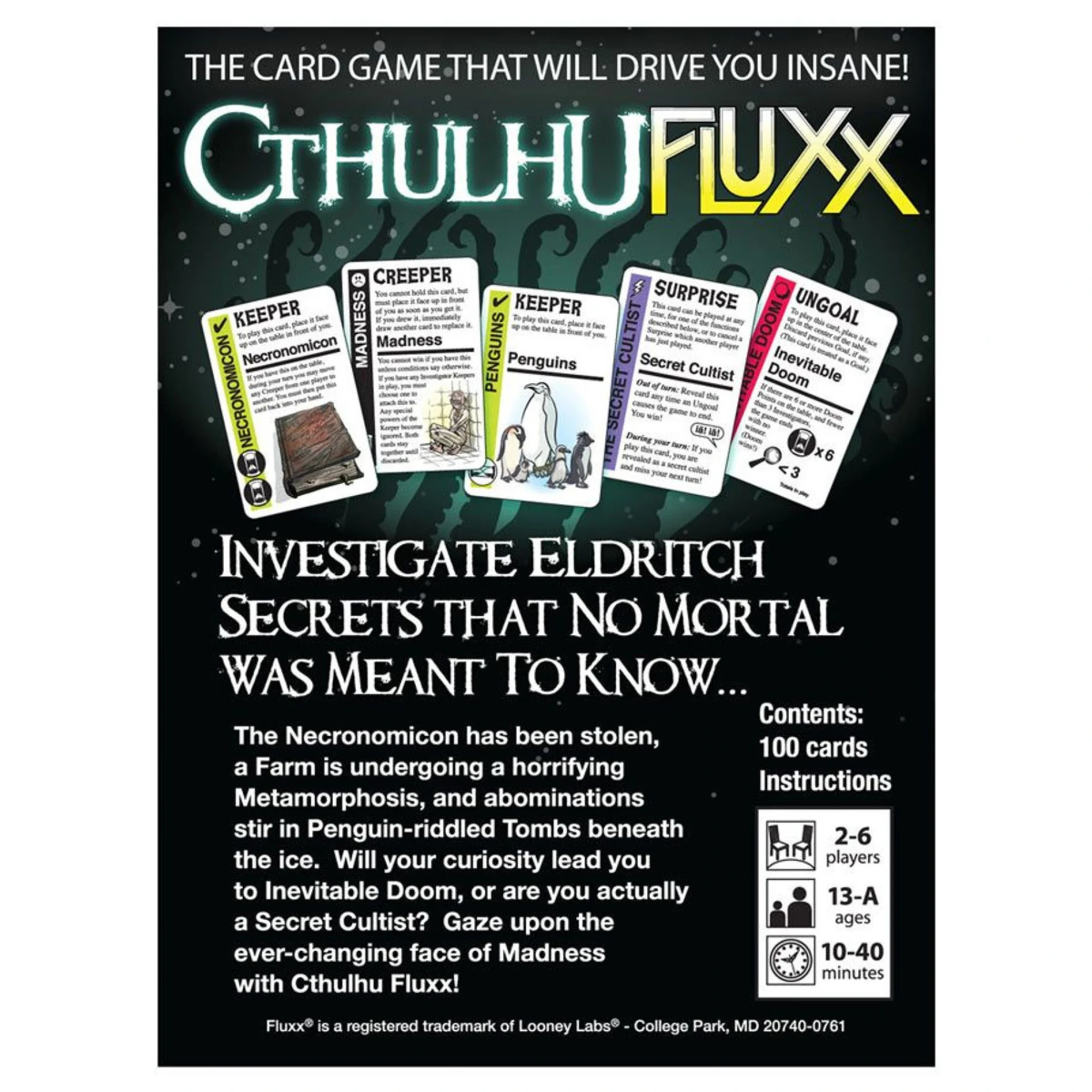New Cthhulu Fluxx Fluxx Cthulhu blends fun gameplay with shifting rules, dark humor, and thematic card interactions perfect for fans of cosmic storytelling! Sales Tax: $1.35 $19.95 Add To Cart Buy Now Description Fluxx Cthulhu – A Fluxx Card Game of Cosmic ChaosWhen fans discuss the most memorable versions within the Fluxx card game line, Fluxx Cthulhu rises quickly to the top. This version embraces the unsettling lore of classic cosmic horror and blends it into the ever-shifting Fluxx gameplay that players already know. The combination turns every round into a shifting, eerie puzzle where victory might be possible… if you can remain sane long enough. Fluxx Cthulhu captures the iconic mood of unknowable dread while still functioning as a clever, funny, and surprisingly social party card game.This is a Fluxx game where the rules never stay still, the goals twist like something with too many tentacles, and your mission to win is constantly undermined by the creeping influence of Creep cards, Doom symbols, and powerful artifacts from beyond the veil. The result is a version filled with strategy, unpredictability, and the type of table tension that fans of Lovecraft-style adventures adore.Fluxx Game Structure with Ever-Changing RulesLike the original version, Fluxx Cthulhu begins with the familiar one basic rule: Draw one card, Play one card. You start with three cards in hand, take your draw, then choose a single card to play. That simplicity lasts for all of about thirty seconds. As soon as someone plays one of the many New Rule cards, the structure warps, twists, mutates, and reshapes itself into some new configuration. Perhaps you draw three. Perhaps you play two. Perhaps hands shift. Perhaps sanity shifts. Perhaps the entire table trembles under a new condition no one asked for.With each turn, the ever changing rules mimic the unsteady feeling of venturing into forbidden tomes. Even the object of the game won't stay put. The moment someone plays a new Goal card, everyone's plans unravel. One minute you’re pursuing "The Summoning," the next you’re racing toward "The Stars Are Right" while trying to avoid any combination that pushes the table closer to collective doom.Fluxx Cthulhu Gameplay Themes and Cosmic FeaturesWhat makes Fluxx Cthulhu distinct within the broader group of Fluxx games is its thematic layering. Instead of simply adding a setting, it integrates cosmic danger into the foundation of the rules. Many cards introduce Doom, Madness, and other destabilizing forces that make the direction of the game far less predictable. Players encounter dark relics, forbidden knowledge, eldritch characters, and creatures that have no business being in polite society.Players might debate strategy while peeking nervously at their collection of Keepers, hoping no unexpected combination triggers a catastrophe. Some cards offer powers that help you advance toward your win condition, but others threaten to disrupt everything right as victory seems close. You might be progressing toward a goal only to have a single play transform the atmosphere with the kind of grim humor synonymous with Cthulhu-themed media.One of the most memorable twists comes from the Creeper cards, which bring danger the moment they appear. Unlike standard Keepers, Creepers attach themselves to players immediately, often blocking victory until removed or redirected. In Fluxx Cthulhu, these Creepers are more than mere inconveniences—they’re thematic obstacles that embody the slow pull toward cosmic despair.Fluxx Cthulhu, Strategy, and Table DynamicsLike any strong card game, Fluxx Cthulhu rewards players who pay attention to the constantly shifting rules, track their opponents’ intentions, and respond quickly. Yet it never demands heavy rules memorization or intimidating complexity. This makes it ideal for fans of cosmic horror stories who want a fun game accessible enough for casual groups but intricate enough to feel hauntingly clever.Players often find themselves laughing at unexpected turns, especially when cards interact in strange ways. That tension—half funny, half unnerving—perfectly suits the Cthulhu theme. Players may try to build clever combinations around Keepers such as books, cultists, artifacts, or locations, but every plan must account for the possibility of immediate reversal.Like other Fluxx games, this version thrives when played with friends, family, or hobby groups who appreciate surprises. It delivers chaos without feeling random and strategy without feeling burdensome. And because victory conditions shift every few minutes, players always stay engaged. Even when someone seems far behind, a single card can change everything.Why Fluxx Cthulhu Appeals to Fans of Fluxx and Cosmic HorrorFor players familiar with titles like Zombie Fluxx, Star Trek Fluxx, Fluxx 5.0, or themed versions like America Fluxx, this entry stands out for its mood and pacing. It's atmospheric enough to feel thematic, yet still welcoming for newcomers who may have never played a Fluxx game before.Fans of cosmic storytelling appreciate:The creeping tension of Doom symbolsThe surprise of Keeper interactionsThe danger of Creep cardsThe mood of ancient secrets and powerful relicsThe sense of adventure mixed with dark humorMeanwhile, card game fans appreciate:Simple starting rulesFast roundsEndless replay valueChaotic but strategic gameplayThe familiar Fluxx structure enhanced by thematic twistsA Family-Friendly Cosmic ExperienceAlthough inspired by cosmic horror themes, Fluxx Cthulhu keeps gameplay suitable for ages 8 and up. The art leans into eccentric mystery rather than visceral fear, making it accessible to groups who enjoy imaginative storytelling without pushing into extreme territory.This also makes the game flexible for different settings, including:Game nightsFamily gatheringsHobby store tablesConvention demosCasual rounds at coffee shopsFans introducing newcomers to FluxxThe balance of strategy and unpredictabili