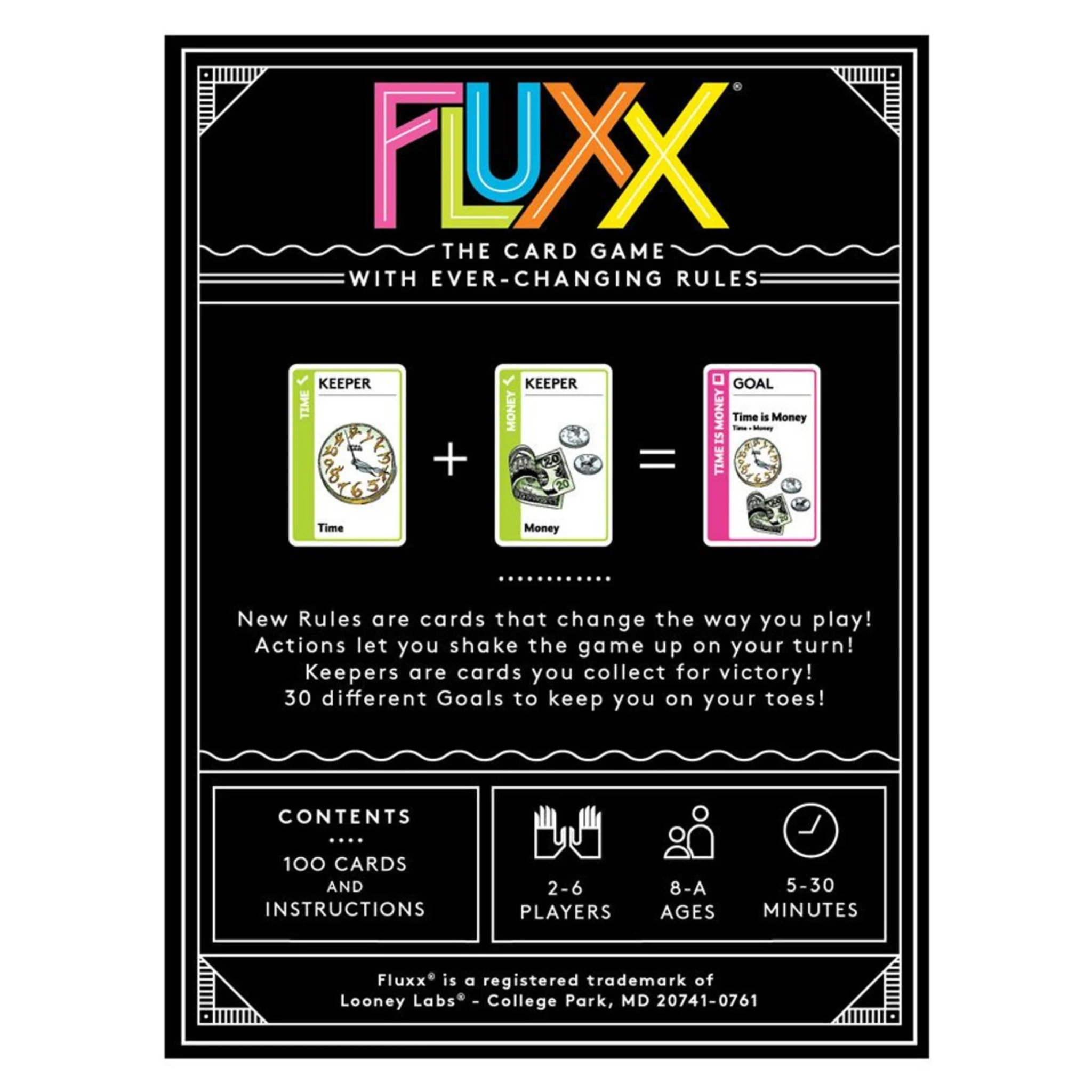 New Fluxx 5.0 Explore Fluxx, the card game built on ever changing rules. Draw, play, and react as the goal shifts from turn to turn in this fun game for all ages! Sales Tax: $1.35 $19.95 Add To Cart Buy Now Description FluxxFluxx Card Game OverviewFluxx is the card game defined by ever changing rules, unpredictable turns, and a constant sense of surprise that keeps every round fresh. As one of the most well-known Fluxx games published by Looney Labs, this title has become a favorite choice for board game nights, family tables, casual gatherings, and anyone who enjoys a fun game built on clever twists.Unlike most card games that follow a fixed structure, the fluxx game experience deliberately reshapes itself as players draw, play, and react to shifting instructions. It begins with one basic rule: draw one card, play one card. From this simple foundation, the entire table evolves through new rules, goal card swaps, action cards, and Keeper and Creeper interactions that alter the current rules and the path to winning.Fluxx brings a style all its own. The original version introduced players to chaotic game play where even the object of the game shifts quickly, and this new edition continues that tradition with polished gameplay, streamlined rules, and the classic four card types fans know well. For board gamers, TCG players, party game enthusiasts, and hobbyists looking for something fast, enjoyable, and endlessly replayable, Fluxx is a natural fit.Fluxx Game Features and Gameplay StyleThe core of the fluxx card game lies in the freedom each player has to change the flow of the round. A game might begin with simple actions, only to transform moments later when someone plays new rules such as Draw 3, Play All, or Hand Limit 1. A carefully planned strategy may collapse when another player swaps the goal card, reducing someone’s near victory to nothing—or creating a sudden win for someone else at the table.Fluxx games have always embraced this sense of motion. Every card affects how many cards you draw, how many you play, how many you keep, or what combination of Keepers will win the game. With only one goal card allowed at a time, players swap them rapidly, pushing the game toward world peace one moment and Bread and Chocolate the next. Part of the fun comes from trying to track the current rules and spot the one opportunity to achieve the active goal before anyone else reacts.Despite the shifting mechanics, Fluxx remains family friendly, accessible, and easy for newcomers to understand. Sticking to the four classic card types makes learning the game simple. Many players discover that the flexible structure makes fluxx games great for both beginners and seasoned board gamers, especially those who enjoy unpredictable strategy and fast resolution.This version of Fluxx is updated for clarity, smoother pacing, and even more fun across all ages. With a play time of 5 to 30 minutes, it fits into short sessions or long game nights with equal comfort.Fluxx Games and Their Ever Changing RulesOne of the reasons Fluxx stands out among modern card games is its use of ever changing rules. Most games rely on a stable rulebook. Fluxx puts the rulebook in the deck. This style sets it apart from titles like America Fluxx, Star Trek Fluxx, Zombie Fluxx, Stoner Fluxx, and many other versions that expand on the concept with new themes, characters, and humorous twists.The constant motion of the rule cards is what makes each round unpredictable. The moment a new rule enters play, every player must immediately respond. Some rules change the draw count. Others shift how many cards you may keep or how the table resolves Keeper effects. Some meta rule cards adjust the structure of the entire game, creating unique situations where players must rethink their approach while trying to track the current rules.Changes can be dramatic. A long strategy involving several cards may be undone when someone introduces a fresh rule that limits hand size. A strategy being built toward one goal card may collapse when another player replaces it with a new objective. Because even the object of the game changes, players must remain alert each round.Fluxx appeals to those who enjoy games where no two rounds look the same. The deck contains several cards that push the game into a wild rhythm, and that is exactly why fans return to Fluxx again and again.Fluxx Card Game Components, Cards, and Game FlowA round of Fluxx begins with each player holding three cards. From that moment forward, the game is entirely shaped by what the deck reveals. The card types include:New Rule cards that rewrite the structure of the game play.Goal cards that determine what combination of Keepers leads to winning.Action cards that trigger immediate effects such as swapping hands, drawing extra cards, or discarding several cards.Keeper cards that remain in front of you until a goal card demands a certain pair.Creeper cards (in some versions) that interfere with your plans and may prevent winning until removed.The fluxx card game thrives on interaction. One card can shift the entire table’s strategy, and players must respond immediately. With so many rule cards quickly altering how the game operates, Fluxx encourages players to rethink tactics on the fly, match changing conditions, and take advantage of unexpected combinations.While some card games depend on long-term planning, Fluxx rewards flexible thinking. This creates a fun game dynamic where rounds feel fast, crazy, and enjoyable. You may hate the sudden twists one moment and laugh at the next unexpected turn the following moment. That blend of unpredictability is part of what makes Fluxx so memorable.The deck in this updated version includes refreshed art, modernized rules text, and a streamlined structure that keeps the game progressing smoothly. Fans may recognize references to the original version, fluxx blanxx, promo cards, and fluxx dice, but this edition stands strong as the base game for everyone