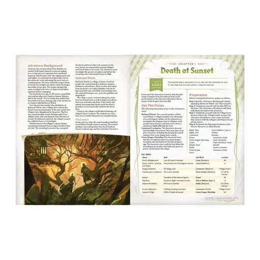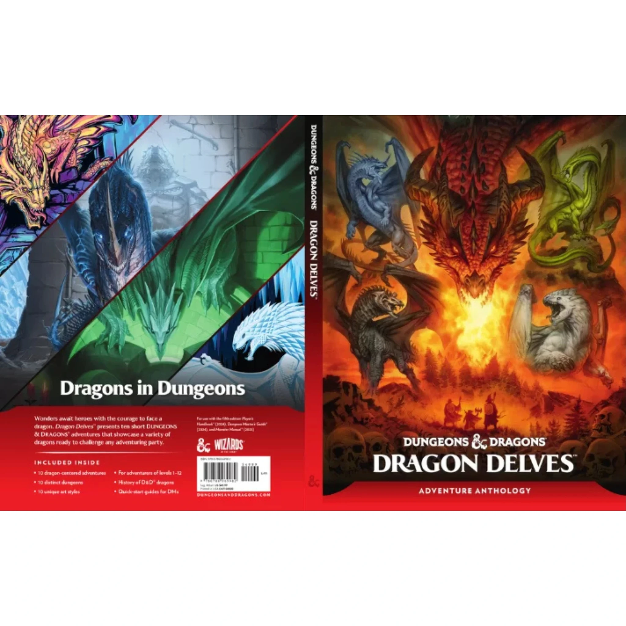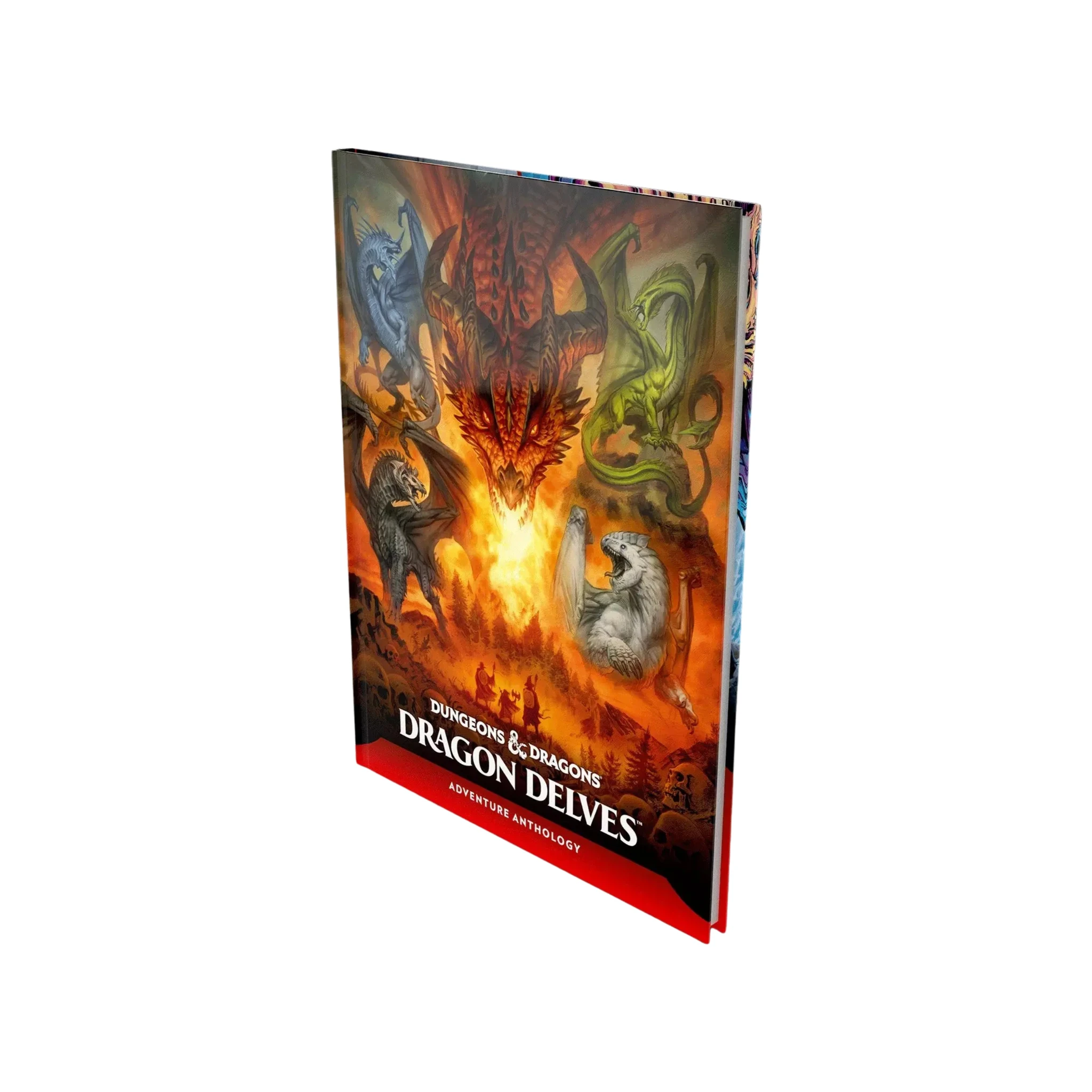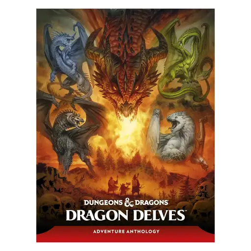 Dragon Delves Dragon Delves offers 10 ready-to-play D&D adventures with chromatic and metallic dragons, stunning art, and streamlined DM guides! Sales Tax: $2.70 $49.99 $39.95 Add To Cart Buy Now Description Dragon Delves - Dungeons & Dragons Adventure AnthologyThe worlds of Dungeons & Dragons have always been defined by dragons. With Dragon Delves, you can bring these legendary creatures to the forefront of your next campaign. This 192-page hardcover collection delivers ten fully realized adventures for characters from level 1 through 12, each designed to immerse players in mysterious dungeons and captivating fantasy locations while meeting every type of chromatic and metallic dragon.A Landmark D&D Adventure AnthologyFor the first time in D&D’s history, a single adventure book offers a dedicated quest for each chromatic and metallic dragon. Whether you dream of outwitting a cunning red dragon, negotiating with a wise gold dragon, or exploring the eerie lair of a black dragon, Dragon Delves places you right in the heart of these encounters.Each of the ten adventures can be run as a standalone dnd adventure or seamlessly woven into an existing campaign. From a stolen pirate base protected by a bronze dragon to a forbidden vale haunted by an evil dragon, the anthology provides options for every table. Experienced players and new adventurers alike will find the content accessible and rich with story potential.Dragons for Every TableThe beating heart of this book is its dragons. Inside, you’ll meet every classic type:Chromatic Dragons – Red, black, blue, green, and white dragons, each with their own devastating powers and unique temperaments.Metallic Dragons – Gold, silver, bronze, brass, and copper dragons, offering quests of intrigue, mystery, and sometimes uneasy alliances.Every dragon is presented with detailed stat blocks, key NPCs, and key plot points that highlight their motives and magical abilities. Each adventure features a distinct challenge, from negotiating a magical song with a silver dragon to halting a shivering death brought by a white dragon.Diverse Fantasy LocationsEvery chapter in Dragon Delves transports you to a new and richly imagined setting. Among the different fantasy locations you’ll explore are:A sandstone city besieged by a cunning blue dragon.An island monastery where a bronze dragon hides ancient secrets.A forbidden vale where an evil green dragon manipulates the local fauna.A mysterious dungeon once used as a stolen pirate base, now guarded by a vigilant copper dragon.These settings are perfect to drop into your ongoing campaign or to serve as the foundation of a brand-new series of quests.Unique Art Styles and Stunning Dragon ArtVisually, this book is a treasure. Dragon Delves features dragon art rendered in 10 unique art styles, with contributions from ten celebrated illustrators and seven talented cartographers. Each adventure begins with a full-page dragon illustration drawn from throughout Dungeons & Dragons history, giving players and Dungeon Masters a vivid sense of scale and drama.From bold, modern character designs to classic throwback pieces, the artwork captures the iconic monsters that have defined D&D for decades. Behind-the-scenes commentary provides a rare glimpse into the creative process and the new dragon redesigns that make this collection stand out.Streamlined Preparation for Dungeon MastersRunning a game with dragons at its heart can be challenging, but Dragon Delves makes it simple. Each adventure is built for streamlined prep with a detailed quick start guide that highlights:Key NPCs and their motivationsEssential story beats and key plot pointsStat blocks for dragons and other iconic monstersNotes for scaling encounters to suit your party’s levelThis practical design lets Dungeon Masters spend less time organizing and more time running the game. Whether you’re planning an impromptu one-shot or integrating a dragon quest into your ongoing story, Dragon Delves saves hours of preparation.Ready-to-Play AdventuresNeed a ready to play adventure for tonight’s game night? Each chapter stands on its own, allowing you to pick up and play with minimal notice. The modular format makes it easy to adapt to any setting—whether your heroes are wandering the forgotten corridors of Candlekeep, sailing the seas of the Sword Coast, or trekking through the Radiant Citadel.You can run these adventures as one shots, link them into a larger campaign, or even create your own adventure inspired by the dragons and captivating fantasy locations inside.Legendary Encounters for All LevelsThe ten adventures in Dragon Delves span levels 1–12, making it easy to find the right challenge for your party. Early-level groups can start with the intrigue of a bronze dragon who guards a stolen pirate base, while seasoned heroes might confront the raw power of a gold dragon defending a magical song that shapes reality.For Dungeon Masters seeking inspiration or players craving thrilling encounters, this book delivers dragons of every unique temperament, from cunning schemers to noble allies.Expand Your Campaign WorldIntegrate these adventures into an existing campaign or start fresh. Each story includes guidance for connecting to classic D&D settings like the Yawning Portal, Candlekeep Mysteries, and the Golden Vault. Want to add a dragon subplot to your ongoing arc? Use the quick start guide and encounter hooks to drop a dragon adventure into any world.Behind the Scenes of Dragon LoreFans of Dungeons & Dragons lore will appreciate the rich references to the game’s storied past. The book celebrates the evolving depiction of dragons across decades of D&D, including callouts to the work of designers like Jeremy Crawford and Chris Perkins. With nods to past anthologies such as Candlekeep Mysteries and Journeys Through the Radiant Citadel, it situates Dragon Delves within the broader history of the game.Perfect for Every TableWhether you’re a seasoned Dungeon