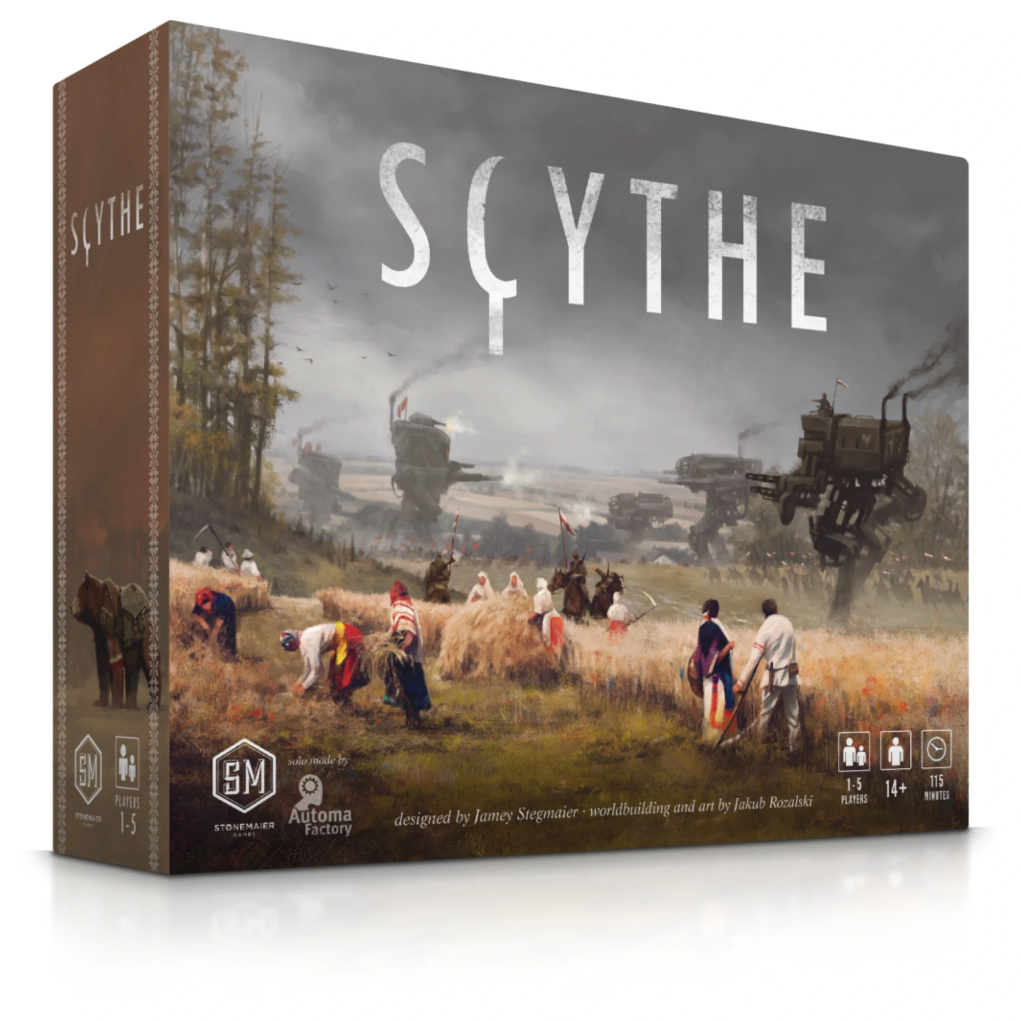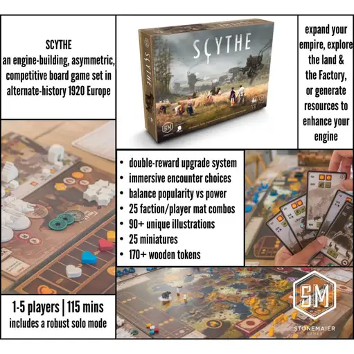 New Scythe It is a time of unrest in 1920s Europa. The ashes from the first great war still darken the snow. The capitalistic city state known simply as “The Factory,” which fueled the war with heavily armored mechs, has closed its doors, drawing the attention of sev Sales Tax: $5.74 $105 $84.99 Add To Cart Buy Now Description Scythe Board GameMaster Strategic Empire Building in Alternate 1920s EuropaIt is a time of unrest in 1920s Europa. The ashes from the first great war still darken the snow. The capitalistic city state known simply as “The Factory,” which fueled the war with heavily armored mechs, has closed its doors, drawing the attention of several nearby countries.Scythe Board Game available at Backwoods Wizards delivers an engine building game set in this alternate history where farming and war, broken hearts and rusted gears, innovation and valor collide. Designed by Jamey Stegmaier of Stonemaier Games, this base game supports 1-5 players across approximately 115 minutes of deeply strategic gameplay. Each player represents a fallen leader attempting to restore their honor and lead their faction to power in Eastern Europe through territory control, resource management, and tactical deployment of monstrous mechs.Why You’ll Love ScytheAsymmetric Faction Play – Command one of five factions, each offering different abilities, starting positions, and strategic pathways to victoryStreamlined Action Selection Mechanism – Choose from four top-row actions with minimal downtime, keeping gameplay moving at a brisk paceMultiple Paths to Victory – Earn stars through combat, engine building, completing objective cards, or expanding your territory controlPremium Components – 25 detailed miniatures, custom wooden resources (no generic resource cubes here), and dual-layered player mats that prevent pieces from shiftingStrategic Depth Without Dice Rolling – Master game mechanics that reward planning over luck, giving you almost complete control over your faction’s destinyWhat Makes Scythe DifferentMost war games focus entirely on direct conflict, while typical engine building games often feel like multiplayer solitaire. Scythe integrates both approaches seamlessly.Scythe Board Game is built differently:Cold War Tension – Combat is costly and strategic, creating psychological pressure without constant battles; winning fights costs power and combat cards, while losing damages popularityIntegrated Mechanisms – Engine building, territory control, and resource production work together so that every decision ripples across your entire strategyThematic Immersion – Polish artist Jakub Różalski’s stunning artwork brings the dieselpunk alternate reality of 1920s Europa to life, making each encounter feel like stepping into newly explored landsHow Scythe WorksChoose Your Action Select one of four columns on your player mats: Move, Bolster, Trade, or Produce. You cannot repeat the same action in consecutive turns (except with Rusviet’s faction ability), forcing varied tactical approaches.Execute Bottom-Row Actions Build structures, deploy mechs, enlist new recruits, or upgrade your capabilities. These powerful actions accelerate your engine building and unlock faction-specific mech abilities.Race to Six Stars Earn stars through achievements—deploying all mechs, winning combat, building structures, completing your hidden goal, and more. When any player places their sixth star, the game immediately ends.Victory is determined by total coins earned from territories you control, resources gathered, stars placed, and your popularity multiplier. The whole game rewards balanced strategy over pure aggression.Product DetailsPlayers: 1-5 players (includes Automa cards for solo play)Playtime: 115 minutes averageAge Range: 14+ yearsDesigner: Jamey Stegmaier (Stonemaier Games)Included in the Box:1 game board5 dual-layered player mats5 faction mats3 rulebooks and guides2 power dials31 Automa cards (solo variant)28 encounter cards23 objective cards42 combat cards12 factory cards25 miniatures80 custom wooden resources40 custom wooden meeples20 custom wooden structures50 wooden tech cubes & recruits30 custom wooden stars15 custom wooden player tokens80 cardboard coins6 structure bonus tilesand more…Available at Backwoods Wizards with free U.S. shipping over $89Who Scythe Is Perfect ForIdeal for:Strategy gamers who enjoy engine building and area control mechanicsPlayers seeking meaningful player interaction beyond simple direct conflictBoard game enthusiasts who appreciate premium components and the game’s theme brought to life through exceptional artworkGroups looking for games that scale beautifully from a two player game to fiveAnyone ready to play Scythe and experience one of the most acclaimed other games in modern hobby gamingWhether you’re a competitive tournament player or enjoy casual strategy nights, the Scythe experience delivers at every player count.Frequently Asked QuestionsIs Scythe a war game? Not primarily. While players conquer territory and engage in combat, the combat system is selective and costly. Most games see limited battles as the engine building and resource management take center stage. Think of it as cold war tension rather than constant warfare.How long does it take to learn? The streamlined action selection mechanism makes your first game approachable. New players typically grasp the core mechanics within a few turns, though mastering faction-specific strategies and the interplay between objective and encounter cards takes several plays to fully appreciate.Does it work well with 2 players? Absolutely. While the modular board and higher player counts create more territory pressure, the two player game maintains strategic tension through competition for the mysterious factory’s powerful factory cards and control territories that determine final scoring points.What makes the factions different? Each of the five factions features unique abilities that fund