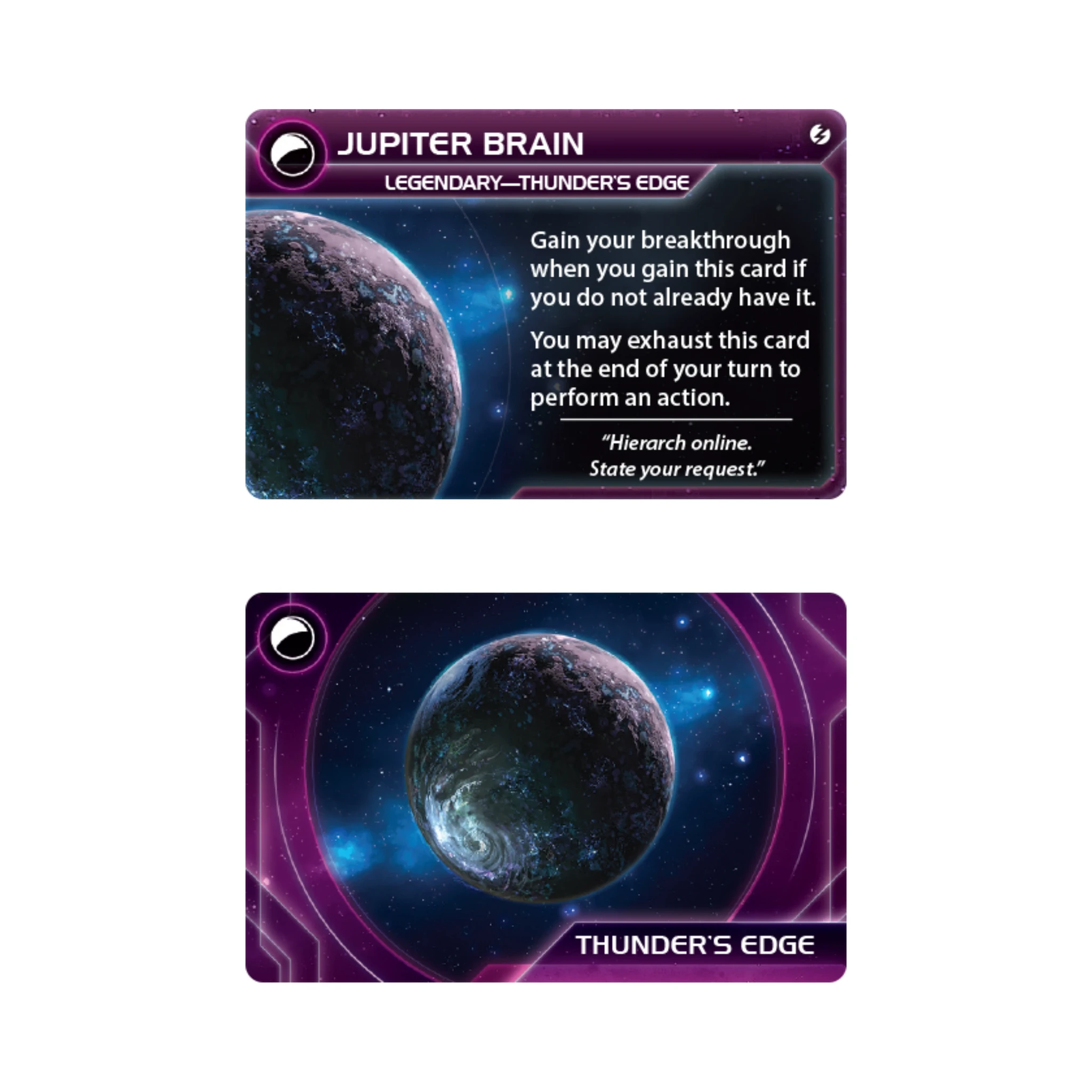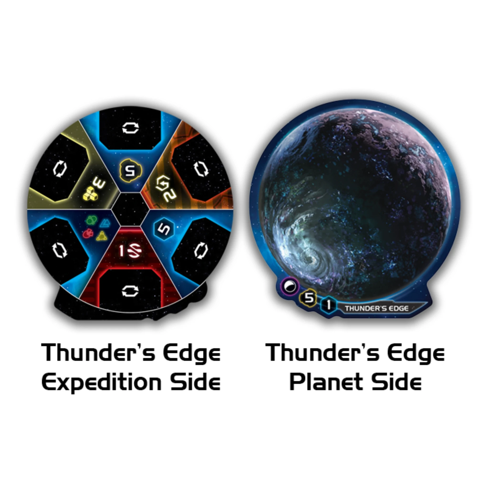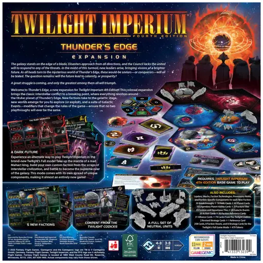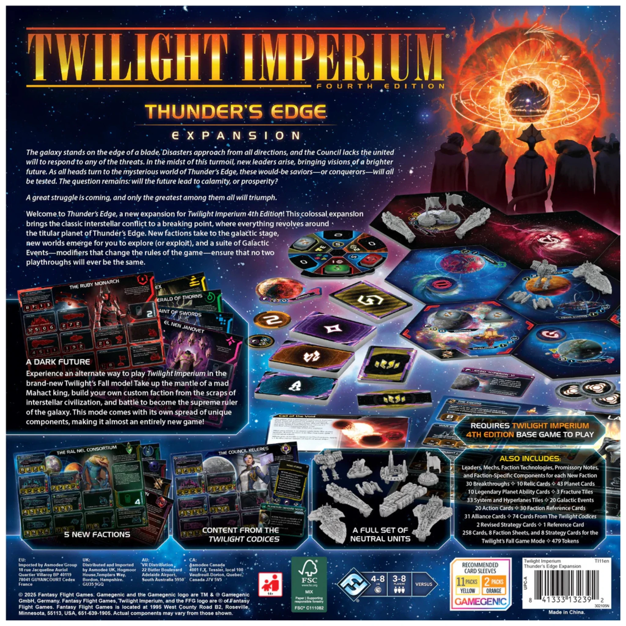 New Twilight Imperium: Thunders Edge Expansion Transform your TI4 campaigns with Thunder’s Edge—massive content, new modes, and strategic depth for seasoned space-opera board game fans! Sales Tax: $8.77 $129.99 Add To Cart Buy Now Description Twilight Imperium Thunder's Edge ExpansionPrepare to chart a new course through the stars, because the Twilight Imperium Thunder’s Edge expansion has arrived. This is not a standalone expansion; it requires the Twilight Imperium Fourth Edition base game to play. This colossal expansion brings a dramatic escalation to the saga of galactic conflict, introducing new worlds, new factions, new mechanics, and a brand-new mode that transforms the game entirely.In the base game and previous expansions, you’ve fought over control of Mecatol Rex, engaged in politics, trade, war and intrigue. With the Thunder's Edge expansion, everything pivots around the titular planet of Thunder’s Edge—and every epic game of TI4 becomes richer and more unpredictable.Twilight Imperium: Colossal Expansion – What this box deliversThis isn’t just another add-on—it’s a full-blown expansion for Twilight Imperium that delivers:Five brand-new playable factions joining the war for the throne.A trove of new system tiles, legendary planet cards, new strategy cards, and Galactic Events that shake up game after game.A game-changing new game mode called Twilight’s Fall, allowing players to build their own custom faction in an alternate dark future.A complete reprint of previously print-and-play content from the Twilight Codex series—now all in one box.Important: This is not a standalone expansion. A copy of Twilight Imperium Fourth Edition is required to play.Thunder’s Edge – Explore the new frontierWhen Thunder's Edge starts, the expedition to the legendary planet begins off-board. Players commit to an expedition to claim “slices” of Thunder’s Edge—each slice requiring a different cost (resources, influence, discards, etc.). Once all slices are claimed, the final slice flips the Thunder’s Edge tile from its expedition side to the planet side, and it is placed into a system. The planet of Thunder's Edge, a mysterious world, becomes the focal point as the player who claimed the most slices gains control and places infantry accordingly.Controlling Thunder’s Edge grants powerful boons—its legendary planet ability (e.g., Jupiter Brain) allows extra actions or breakthrough abilities that shift the tide of the game. As the titular planet of Thunder's, Thunder's Edge stands at the center of the expansion's narrative and gameplay.This singular mechanic adds a dramatic battle for the eponymous world—and it ripples across every strategy in the galaxy.TI4 Thunder’s Edge – Elevating your game experienceFor fans who have played Twilight Imperium Fourth Edition dozens of times, this new expansion delivers freshness and depth. The TI4 Thunder’s Edge experience offers:A massive content update with new factions, tiles, and a different playing field. Each new faction comes with a unique set of faction's abilities that define their strengths and starting capabilities.New “Breakthrough” cards for every faction—unlockable abilities and technology synergies. Each breakthrough acts as a powerful faction specific component, and some factions receive a new faction specific component unique to Thunder's Edge. These cards are crucial for scoring technology related objectives, as they grant flexibility in technology color synergies. When using a breakthrough's synergy effect, you may treat a technology as one color or another, but not both at the same time.A wealth of modular options: choose whether to include Galactic Events, Fracture tiles, new worlds, optional special event cards, or the full Twilight’s Fall mode.Replayability taken to new heights—no two games will feel the same when you mix in these new systems.In other words, if you thought you knew TI4 inside out, Thunder’s Edge will challenge that assumption and reinvigorate your campaigns.Factions and Playstyle – New Powers on the EdgeThunder’s Edge introduces a fresh wave of contenders to the galactic stage, with five new factions ready to stake their claim in the classic interstellar conflict of Twilight Imperium. Each new faction comes with its own unique faction sheet, abilities, leaders, and faction-specific components, offering players a brand new way to play Twilight Imperium and explore innovative strategies.Among these new factions is the Last Bastion, a formidable alliance forged from the Xxcha Kingdom and the Federation of Sol. The Last Bastion excels at making the most of every resource, with abilities like Liberate, which lets them immediately ready a planet when they gain control with sufficient infantry—granting instant access to vital resources and influence. Their advanced space docks, the 4X41C “Helios” VI, further boost the resource value of their planets, while their flagship, the Egeiro, grows stronger as they expand their influence across the galaxy.Players can also galvanize their units, doubling their effectiveness in combat and abilities through the Phoenix Standard and the A3 Valiance mech. With these new factions, every game becomes a fresh challenge, as players experiment with different playstyles and strategies, ensuring that no two campaigns are ever the same. Whether you’re a veteran or just starting to play Twilight Imperium, these new factions add depth, variety, and excitement to every session.Legendary Planets and Space – Uncharted Wonders AwaitThe Thunder’s Edge expansion propels players into a galaxy teeming with legendary planets and mysterious alternate spaces, each offering powerful rewards and strategic opportunities. A new version of Mecatol Rex now boasts a legendary planet trait and its own legendary planet card, reshaping the center of the galaxy with game-changing abilities. Faction-associated legendary planets like Avernus (tied to the