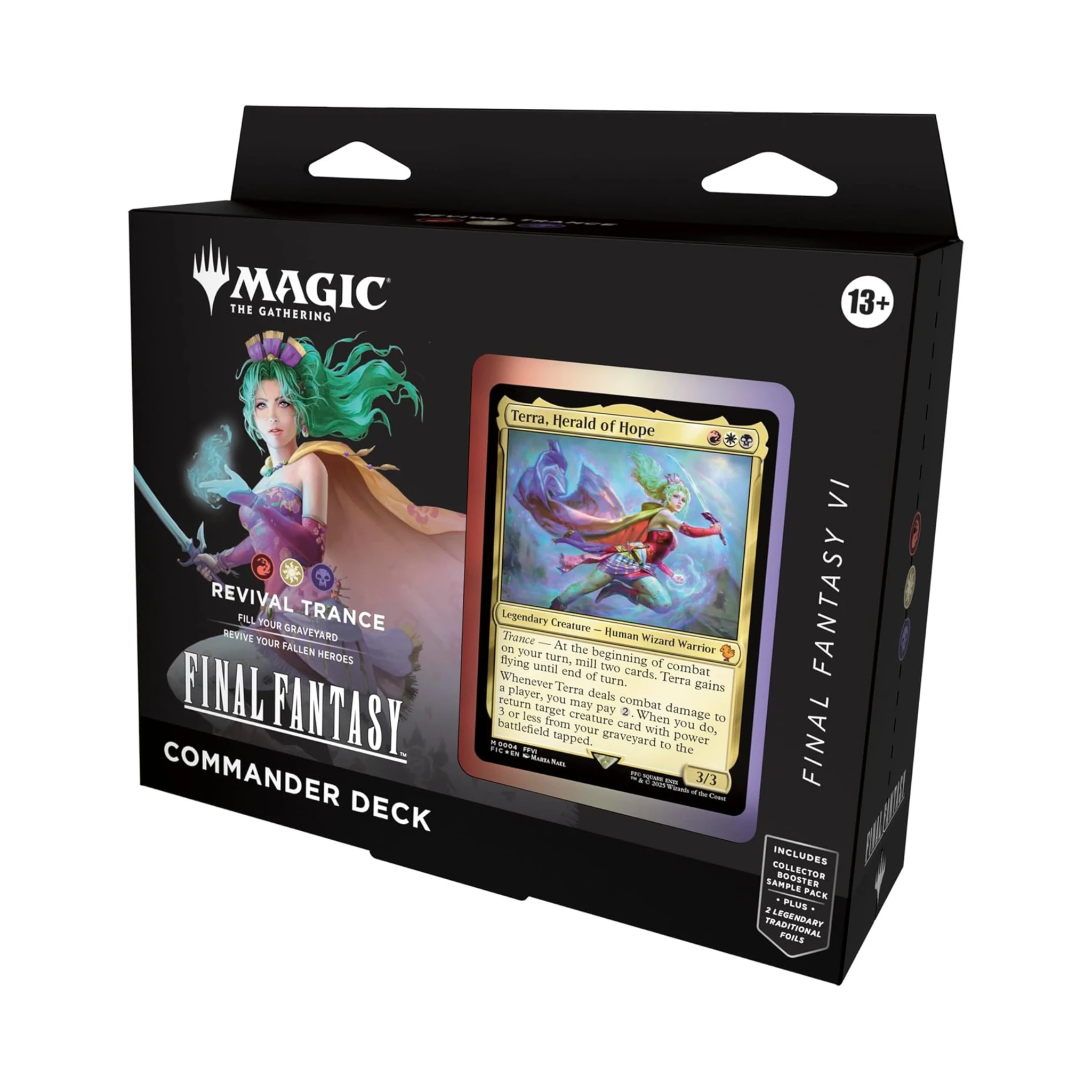 Final Fantasy Commander Deck: Revival Trance Final Fantasy Commander Deck: Revival Trance brings Terra and heroes to MTG. A 100-card ready-to-play deck with Collector Booster Sample Pack! Sales Tax: $3.37 $69.99 $49.99 Add To Cart Buy Now Description Final Fantasy Commander Deck: Revival Trance – Magic Meets Legendary HeroesThe world of Magic: The Gathering has crossed paths with countless realms, but few collaborations have been as highly anticipated as the Final Fantasy crossover. Among the most exciting products to arrive from this collaboration is the Final Fantasy Commander Deck: Revival Trance, a 100-card preconstructed deck that merges the tactical richness of Magic with the legendary characters, themes, and storylines of Final Fantasy VI. For both seasoned Commander players and longtime fans of the Final Fantasy series, this deck is more than a collection of spells and creatures—it’s a celebration of iconic heroes, tragic villains, and the unforgettable saga of hope rising from despair. Central to this tale is Terra, a fabled soldier whose legendary status in the Final Fantasy universe embodies the spirit of heroism and mythic adventure.If you’ve been waiting for the perfect bridge between Magic the Gathering and Final Fantasy, the Revival Trance deck is where the magic begins.Introduction to Commander DecksCommander has become one of the most beloved ways to play Magic: The Gathering, offering a unique blend of strategy, creativity, and social interaction. In this format, each player chooses a legendary commander to lead their deck, building around their abilities and personality. For fans of the Final Fantasy series, the arrival of Commander Decks themed around iconic titles like Final Fantasy VI and Final Fantasy VII is a dream realized. Now, you can step into the shoes of legendary heroes and infamous villains, bringing the magic and fantasy of Final Fantasy directly to your tabletop.Whether you’re rallying Terra and her allies or unleashing the power of Sephiroth, these decks let you experience epic battles in a whole new way. The Commander format is perfect for gathering with friends, sharing stories, and reliving your favorite moments from the Final Fantasy series. Each game becomes a new adventure, as you play, strategize, and immerse yourself in the worlds of Magic: The Gathering and Final Fantasy. With every spell cast and every hero summoned, you’ll find yourself drawn deeper into the fantasy, making every match a memorable part of your gaming journey.What is the Final Fantasy Commander Deck: Revival Trance?The Final Fantasy Commander Deck: Revival Trance is one of the centerpiece decks in the Magic the Gathering Final Fantasy product line. Built specifically for the Commander format, each deck comes with:1 ready-to-play 100-card deck featuring 2 traditional foil Legendary cards and 98 nonfoil cards.25 brand-new-to-Magic cards created exclusively for this crossover.A 2-card Collector Booster Sample Pack for an extra chance at premium foils and showcase treatments.10 double-sided tokens (or in the case of this deck, 6 tokens plus 4 punch-out counters).A deck box designed to hold all the cards in the deck, even when sleeved.A strategy insert and reference card to get you playing right away.All these items included in the box add significant value for collectors and players, making it an appealing choice for fans of both franchises.With Terra, Herald of Hope leading the charge as commander, this deck captures the soul of Final Fantasy VI’s narrative. Built in Red/White/Black (Mardu colors), Revival Trance embraces themes of sacrifice, rebirth, and defiance against overwhelming odds.The Commander – Terra, Herald of HopeAt the heart of the Revival Trance deck is Terra, Herald of Hope. Terra is not only one of the most beloved characters in the Final Fantasy series, but also a perfect thematic fit for a Commander leader. Her ability embodies resilience, magic, and the drive to protect allies in their darkest hour.In gameplay terms, Terra offers unique interactions with spells and graveyard recursion, tying together the deck’s red, white, and black strategy. She is supported by an all-star lineup of heroes and allies from Final Fantasy VI:Celes, Rune Knight – Serving as a warden on the battlefield, Celes is a steadfast warrior who protects the field while supporting spell-heavy plays.Cyan, Vengeful Samurai – A precision fighter whose presence reinforces combat synergy.Shadow and Interceptor – An assassin and his loyal hound, adding layers of tactical depth.Edgar, Master Machinist and Sabin, Master Monk – Brothers who embody the duality of strength and innovation.Locke, Treasure Hunter and Setzer, Wandering Gambler – Wild cards who bring unpredictability and resource management.Mog the Moogle, Gogo the Mime, and Gau the Feral Youth – Fan favorites who add quirky yet powerful abilities.These iconic figures, rendered into Magic the Gathering Final Fantasy cards, give the deck more than just gameplay mechanics—they give it identity, personality, and nostalgia.The Strategy – Hope Rising from the GraveThe Final Fantasy Commander Deck: Revival Trance blends aggressive combat, recursion, and powerful finishers. Its three-color foundation ensures flexibility, while its legendary lineup connects directly to Final Fantasy storytelling.Powerful Finishers: The deck features legendary creatures and summons that can turn the tide of battle. Notably, Leviathan stands out as a powerful summon, capable of influencing the battlefield with its strength and strategic importance.Key Themes:Graveyard Recursion – With staples like Reanimate, Rise of the Dark Realms, and Priest of Fell Rites, your fallen heroes never stay gone for long. This echoes the Final Fantasy themes of revival and perseverance.Board Control – Spells such as Tragic Arrogance, Ruinous Ultimatum, and Mortify ensure you can reset the board when the odds stack against you.Legendary Synergy – 