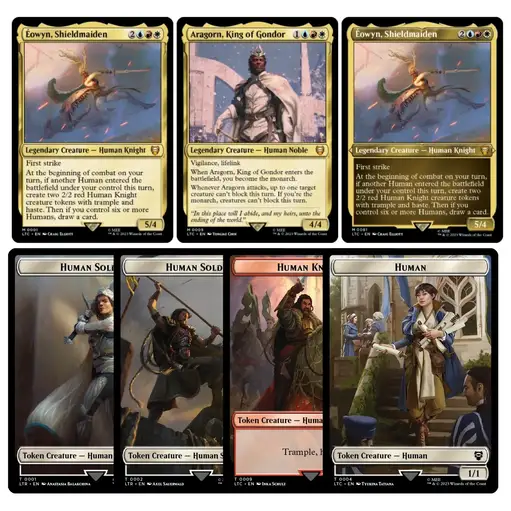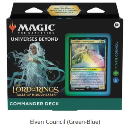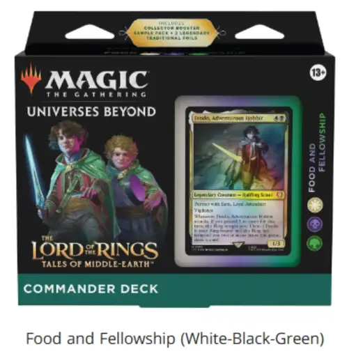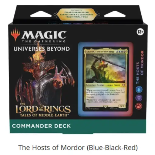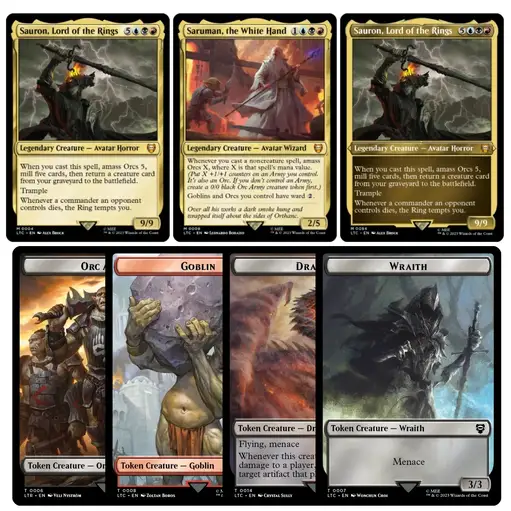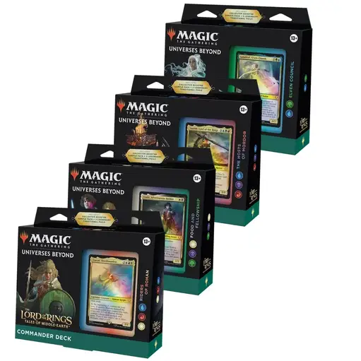 New MTG The Lord of the Rings: Tales of Middle-earth Commander Deck Step into a meeting point of storytelling, strategy, and collectible artistry with the MTG The Lord of the Rings: Tales of Middle-earth Commander Deck—a product that brings together the enduring Magic of mtg and the legendary narrative of Lord of the Rings Sales Tax: $3.04 $44.99 Set The Hosts of Mordor +$30 Riders of Rohan Elven Council Food and Fellowship Add To Cart Buy Now Description Step into a meeting point of storytelling, strategy, and collectible artistry with the MTG The Lord of the Rings: Tales of Middle-earth Commander Deck—a product that brings together the enduring Magic of mtg and the legendary narrative of Lord of the Rings. Designed for both seasoned players and those discovering Magic The Gathering through Tolkien's World, this set of preconstructed commander decks offers a complete experience rooted in gameplay, nostalgia, and community.MTG: A Meeting of Two Iconic WorldsFew collaborations feel as natural as Magic and Lord of the Rings. Both are built on deep lore, unforgettable Characters, and a sense of adventure that spans generations. With this release, Wizards has crafted a bridge between MTG gameplay and the sweeping narrative that began with Tolkien’s Novel and expanded into a global phenomenon. The idea of adapting Tolkien's world into one film was initially considered, but Peter Jackson's vision led to the creation of a trilogy, allowing for a more expansive and faithful adaptation of the source material.Whether you first encountered the journey through the First Chapter of Frodo leaving the Shire or have long followed the Story of Middle Earth, this Deck set captures the Essence of that world. The Lord of the Rings trilogy, released between 2001 and 2003, received widespread acclaim and is ranked among the greatest film trilogies ever made, winning 17 Academy Awards out of 30 nominations—including Best Picture for The Return of the King—and earning praise such as Kenneth Turan's statement that "the trilogy will not soon, if ever, find its equal." In a 2012 Wired magazine poll, The Fellowship of the Ring was voted the greatest fantasy movie of all time, with The Two Towers and The Return of the King also ranking in the top four. It’s not just about cards—it’s about revisiting a Story that shaped modern fantasy and experiencing it through interactive Games.Fans of Tolkien’s Creation will recognize elements that bring All the Characters to life, from Frodo and Sam to Aragorn, Gandalf, and Gollum. The cast’s performances—Cate Blanchett’s deep, emotional portrayal of Galadriel, Hugo Weaving’s noble and enigmatic Elrond, Liv Tyler’s ethereal Arwen, and Sean Bean’s compelling Boromir—were instrumental in bringing Tolkien's world to the screen. The art direction of these Gathering Cards pays tribute to the original Word of Tolkien, blending visual storytelling with gameplay mechanics in a way that feels both authentic and immersive. Aragorn’s journey to become king mirrors the epic battles and cinematic action found in fantasy settings like Tarkir, where dragons soar and legends are forged. Notably, Jackson’s adaptation omitted Tom Bombadil to streamline the narrative, a choice that sparked much discussion among fans. The extended cut editions, released on DVD, added significant new footage and special features, deepening the experience for dedicated viewers. The end credits of the films included acknowledgements and sometimes bonus scenes, further engaging audiences. The trilogy’s sound and visual effects left audiences awestruck—many have heard and seen moments that remain iconic in cinema. The success of the trilogy influenced fantasy media, sparked a surge in merchandise and video games, and boosted tourism in New Zealand, where the films were shot simultaneously from October 1999 to December 2000 with a budget of $281 million.Introduction to Fantasy RealmsStep into a world where imagination knows no bounds. The Lord of the Rings film series, brought to life by Peter Jackson, stands as a landmark in cinematic history—transforming Tolkien’s Middle Earth from the pages of a novel into a living, breathing realm. Every detail, from the rolling hills of the Shire to the towering spires of Minas Tirith, is crafted to immerse viewers in a story that feels both epic and personal.Middle Earth isn’t just a setting; it’s a world with its own history, cultures, and unforgettable characters. Fans of the films and books often find themselves drawn to communities that celebrate this shared passion. Whether you’re joining a Rings fan club or visiting your local game store to discuss the latest deck or collectible, the spirit of Tolkien’s world comes alive through connection and play.For many, the magic of Lord of the Rings is about more than just watching a film—it’s about experiencing a story that continues to inspire new adventures in life, games, and friendships.What You Get: A Complete Commander ExperienceThis product includes all four themed Commander Decks, making it a comprehensive addition to any MTG Precons collection:Riders of RohanFood and FellowshipElven CouncilThe Hosts of MordorEach Commander Deck contains 100 cards, including 2 Foil Legendary Creatures and 98 additional cards carefully designed to reflect the History, Strategy, and Power of their respective factions. Decks can be built around specific mechanical themes or tribes, such as dragons or aristocrats, adding variety and depth to gameplay.Players start with a 100-card deck in Commander and draw seven cards at the beginning of the game.These Preconstructed Commander Decks are ready to Play Magic right out of the box. Whether you’re gathering with Friends at your Local Game Store or hosting a game night at home, everything you need is included.Commander Format: Strategy Meets Social GameplayCommander is one of the most beloved formats in MTG, known for its multiplayer dynamics and e