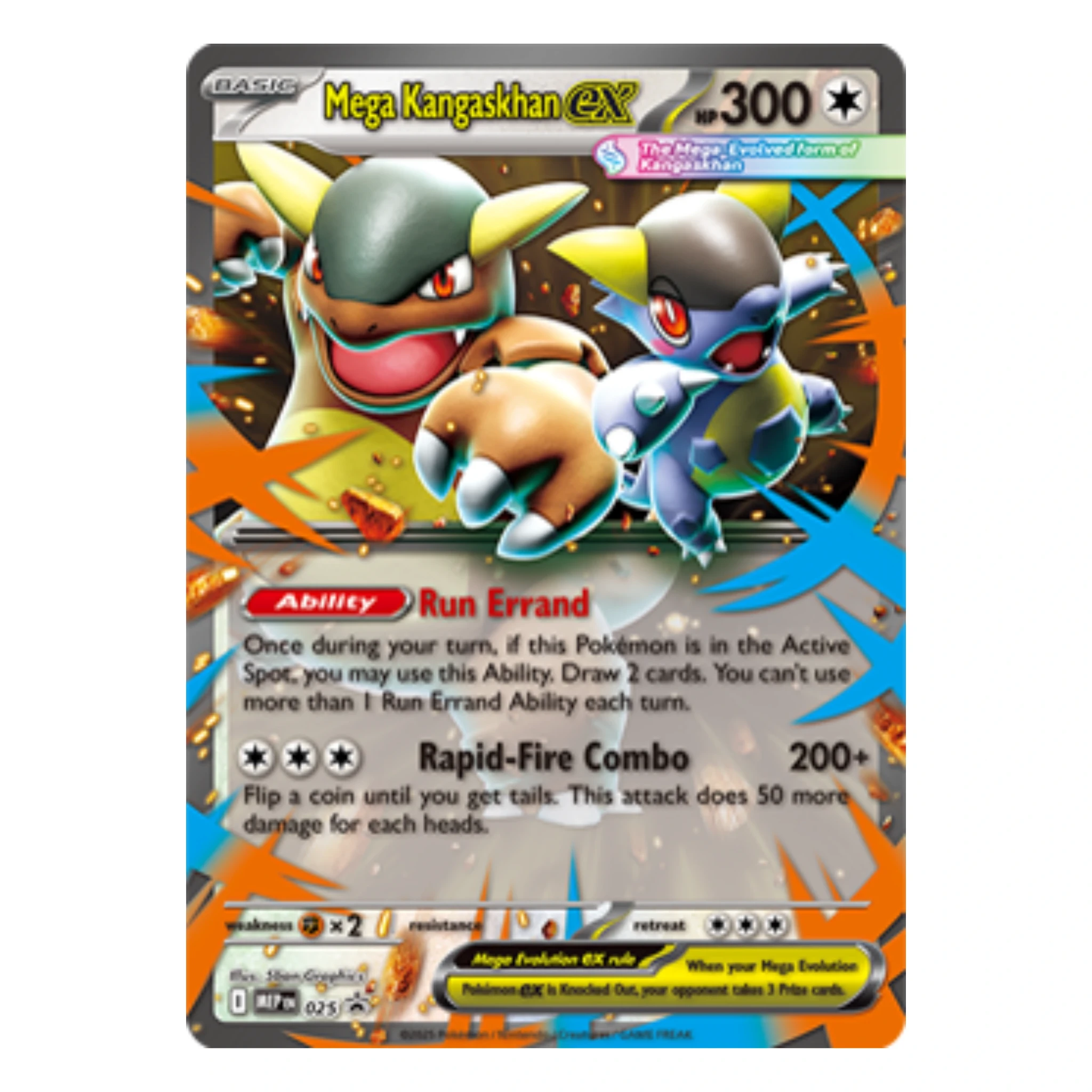 Stock Status: Pre-Order Available Stock Status: Pre-Order Available Stock Status: Pre-Order Available Stock Status: Pre-Order Available Stock Status: Pre-Order Available Pre-Order Pokemon Mega Kangaskhan ex Box -- LIMIT 1 -- Mega Kangaskhan ex arrives in this collector box with a foil promo, lenticular version, and booster packs filled with new possibilities! Sales Tax: $2.02 $49.99 $29.99 Add To Cart Buy Now Description NOTE: Orders containing a pre-order item will not ship until the last pre-order item is available to be shipped. NOTE: Your payment will be processed at the time of your order.Pokemon Mega Kangaskhan ex Box OverviewThe Pokemon Mega Kangaskhan ex Box centers around one of the most iconic parent-child duos in the Pokémon world. Kangaskhan’s Mega Evolution shifts the battlefield by giving both parent and child an active role, creating a distinctive playstyle built around teamwork, timing, and the ability to draw extra cards with Run Errand. This box is designed for collectors, players, and fans who enjoy building decks with strong synergy and memorable design elements featuring Mega Evolution artwork.Inside the box, the star attraction is the playable foil promo card featuring mega kangaskhan ex, supported by an oversize lenticular card for display and four pokémon tcg booster packs to expand your options even further. Fans of pokemon collector box releases will immediately recognize the appeal of this combination: signature art, a showcase piece, and a set of boosters designed to help you find cards that deepen Kangaskhan’s strategy.Pokemon Collector Box Features and Collectible AppealAs a Pokemon Collector Box, this product brings together play-ready content and visual presentation. The lenticular oversize promo blends shifting artwork and depth, creating a display piece that stands out among typical card highlights. Fans who enjoy displaying card art will find that the lenticular finish enhances the impression of Mega Evolution’s power, bringing Kangaskhan and Kangaskhan’s child forward in crisp detail.The playable foil promo version of Mega Kangaskhan ex gives trainers a strong centerpiece card for deck building. Mega Evolution makes Kangaskhan’s child a force that works in tandem with the parent Pokémon, enabling effective combinations, card draw opportunities, and ways to push toward bigger damage through timing and well-planned coin flips. The Run Errand ability offers the chance to draw extra cards in the early game, supporting consistency and helping the deck reach its powerful mid-game momentum.Each piece of the box is crafted to serve collectors and players equally—whether displayed, used in a deck, or stored as part of a long-term collection.Kangaskhan ex Box Play Components and StrategyA central advantage of the kangaskhan ex box is the synergy built around Run Errand and Rapid-Fire Combo. These elements support a playstyle that rewards preparation and smart sequencing. Drawing extra cards with Run Errand helps you set up your board, find Energy, or locate specific combo pieces. After building your position, Rapid-Fire Combo allows you to flip coins to seek bigger damage, pushing Mega Kangaskhan ex toward impressive knockout potential.For players who enjoy strategic decks with interactive attack patterns, this approach offers many decision points. Decks built around this promo can incorporate cards that interact with coin flips, boosting consistency or increasing the chances of achieving higher damage output. Because Mega Kangaskhan takes advantage of both speed and multi-step attack effects, the playable foil promo card provides tactical flexibility in many deck formats.The box includes four pokémon tcg booster packs, giving you opportunities to locate even more cool cards that align with this strategy. Whether you're searching for cards that assist with setup, Energy acceleration, or attackers that support Kangaskhan’s strengths, these boosters let you expand your options right away.Mega Kangaskhan ex Strengths, Artwork, and Display HighlightsThe Mega Kangaskhan ex card stands out visually and mechanically. The artwork depicts the Mega Evolution form, emphasizing the moment when the child joins the attack pattern directly. Mega Evolution makes Kangaskhan’s child a familiar partner that acts as part of the full offensive rhythm of the card. Many collectors appreciate this narrative detail, as it tells a clear story within the artwork itself.Collectors can also enjoy the oversize lenticular version of the promo card. This extra-large piece creates a layered effect when tilted, giving a sense of motion that fits Mega Evolution’s style. As a display item, it works well in stands, display cases, shelves, or near a collection of Pokémon figures. Because the lenticular effect produces shifting visual perspectives, many fans note that it creates a feeling of depth that normal oversized cards do not replicate.The lenticular version and standard-size foil promo together create a cohesive package that appeals both to collectors who focus on presentation and to players who want a card ready for gameplay.Pokémon TCG Booster Packs and Expansion PossibilitiesThe inclusion of Pokémon TCG booster packs ensures that every box opens into possibilities for deck improvement or collection growth. Each booster pack offers chances to find cards that pair well with Mega Kangaskhan’s abilities, such as draw-supporting Trainer cards, Energy manipulation tools, and Pokémon with abilities that interact with coin flips or attack sequencing.Opening four booster packs in one sitting brings variety and anticipation—players often find cards that immediately inspire new deck ideas, while collectors enjoy adding rare cards, alternate artworks, or unexpected finds to their binders. Because each booster pack can contain its own highlight cards, the box feels like an opening experience within a larger opening experience.The packs also give newer players a starting poi